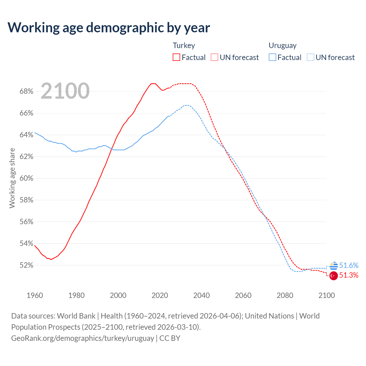 - Turkey has 58.7M working age adults (aged 15-64) vs 2.22M in Uruguay.