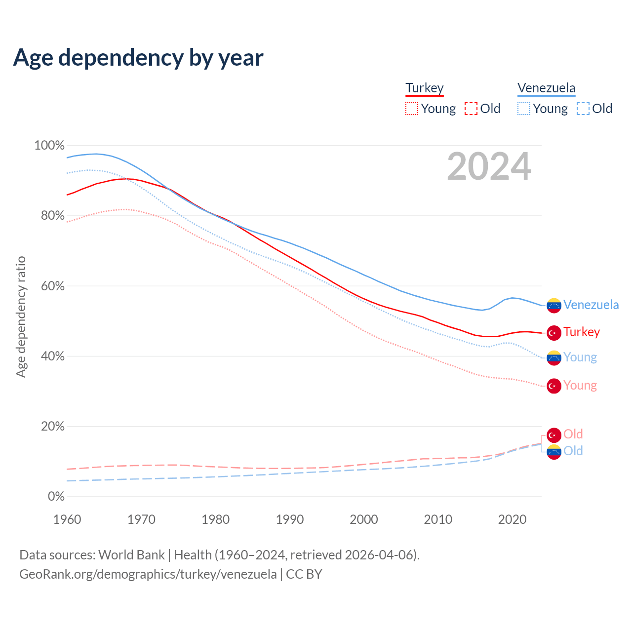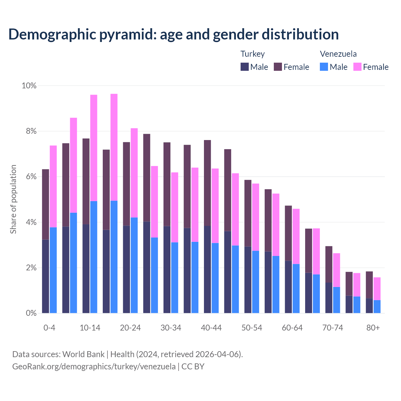 - Turkey is ranked 83/196 by median age (oldest to youngest) vs 104/196 for Venezuela.