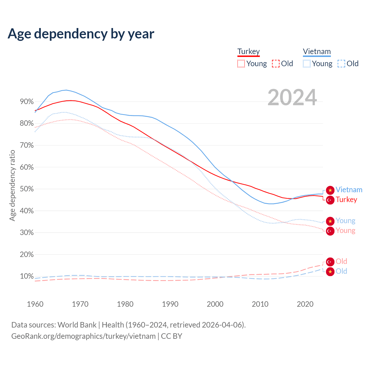 The share of older people aged 65 and over is 10.3% in Turkey and 9.05% in Vietnam. Life expectancy in Turkey compared to Vietnam .