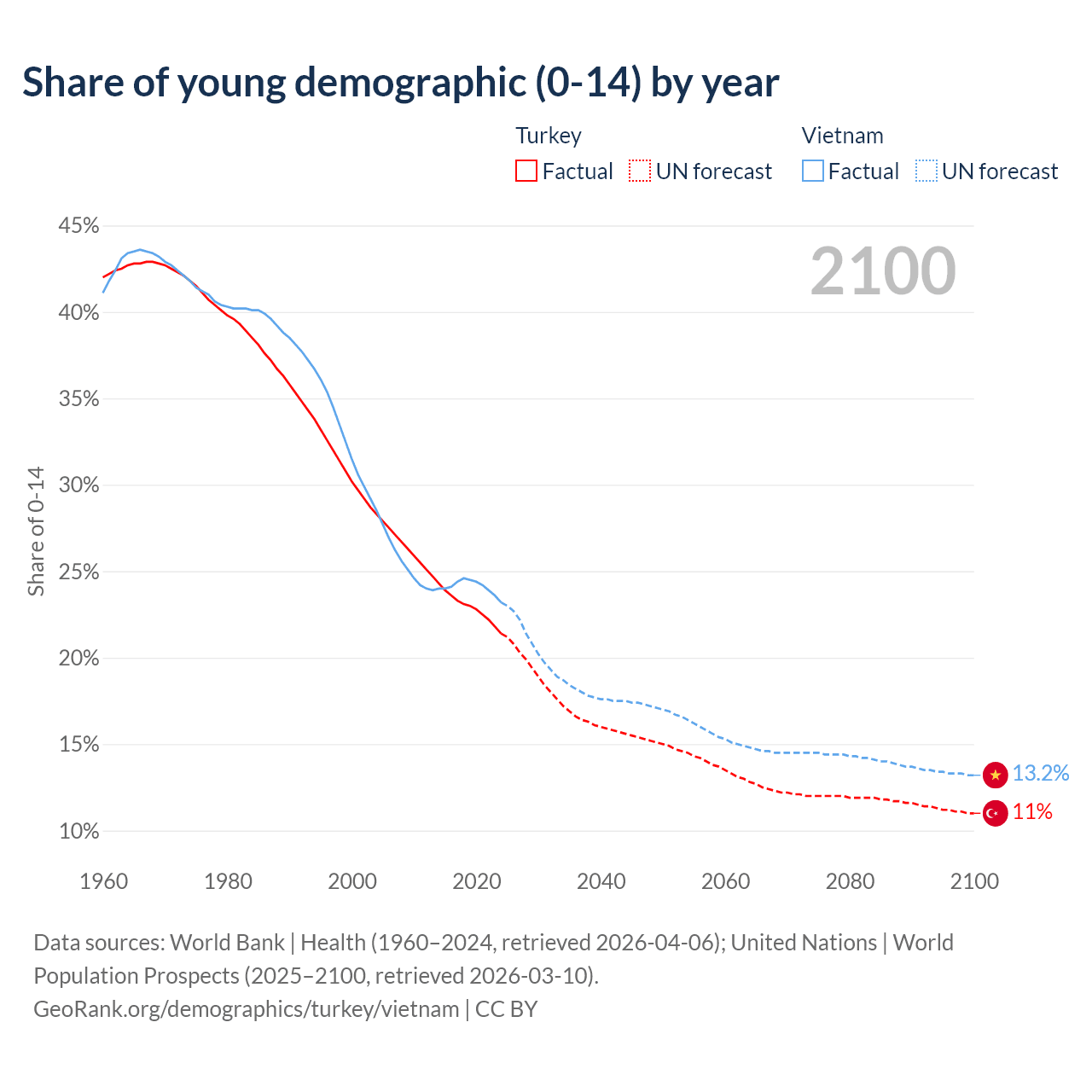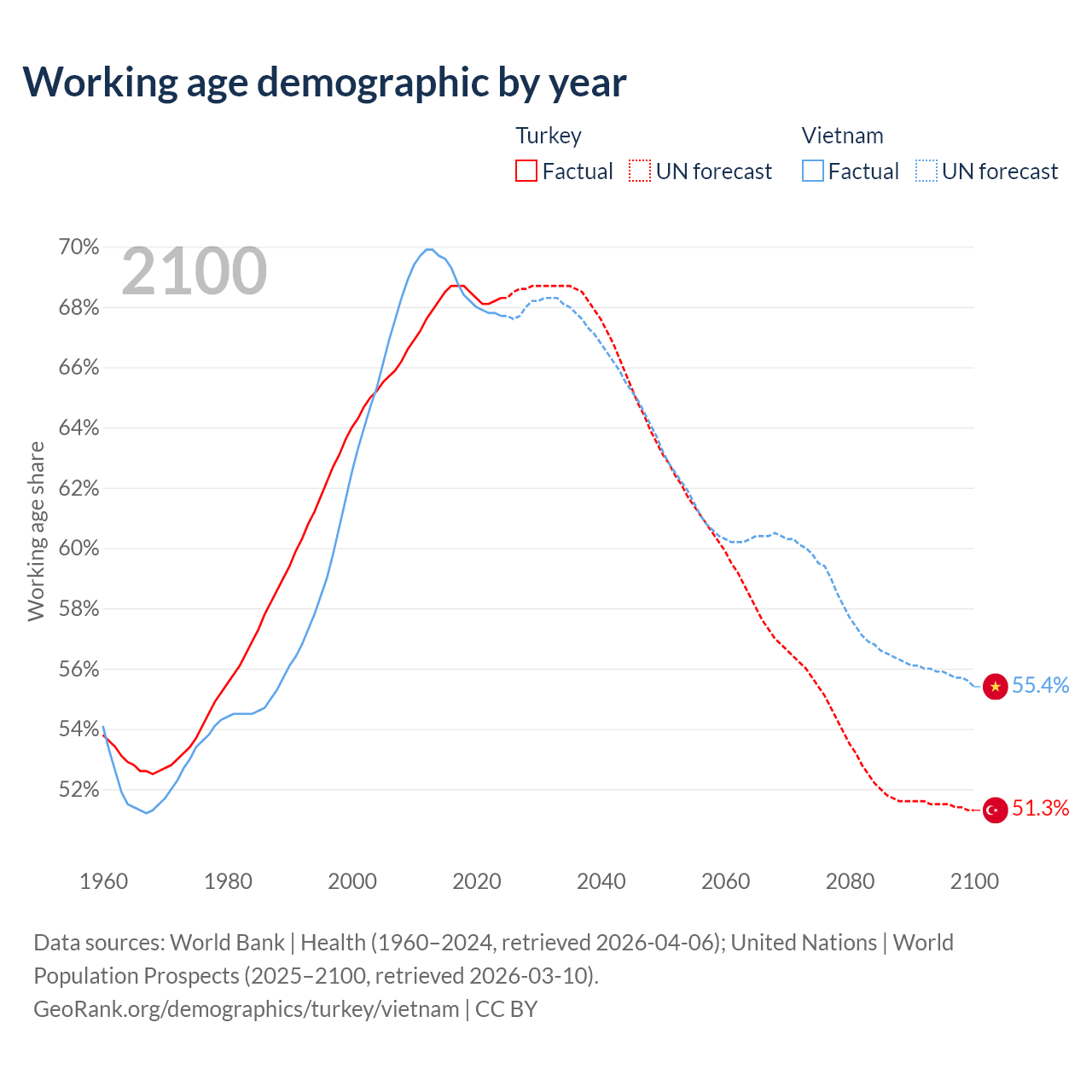 - As of 2026, the population of Turkey is 86M vs 102M in Vietnam.