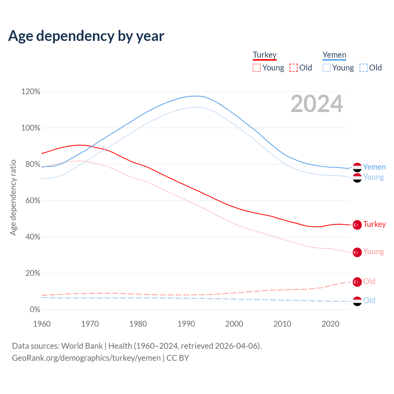 - Turkey is ranked 83/196 by median age (oldest to youngest) vs 174/196 for Yemen.