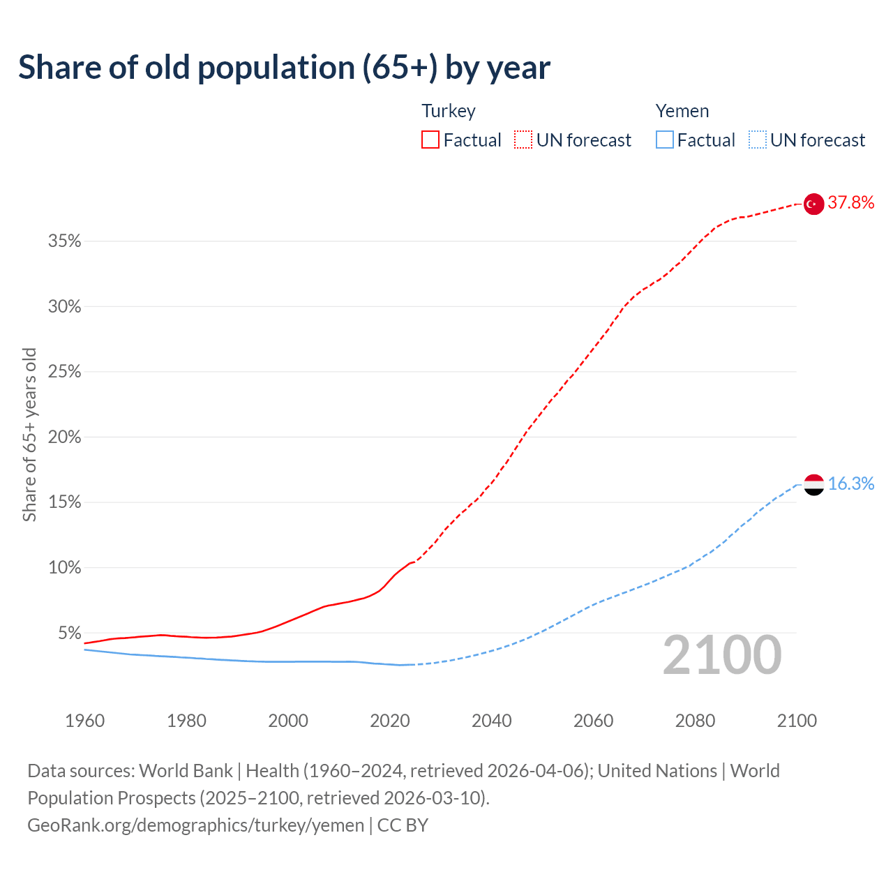 - The share of old-age demographic (65+) in Turkey is 10.3% vs 2.52% in Yemen.