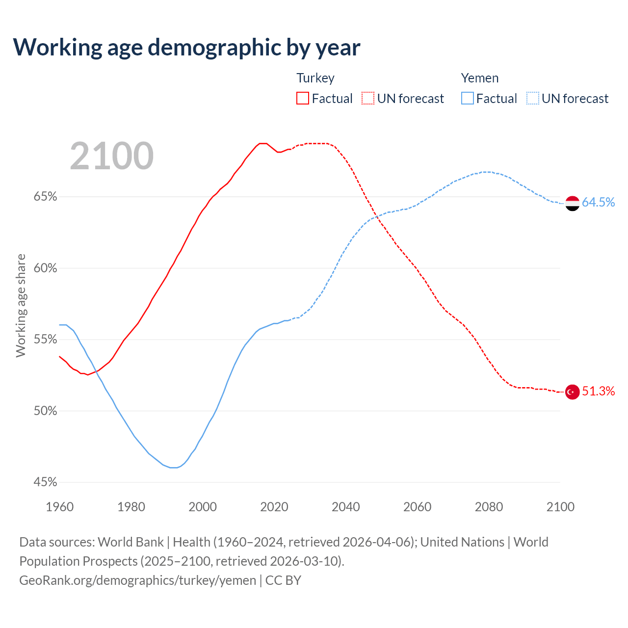 - Turkey has 58.7M working age adults (aged 15-64) vs 24.4M in Yemen.