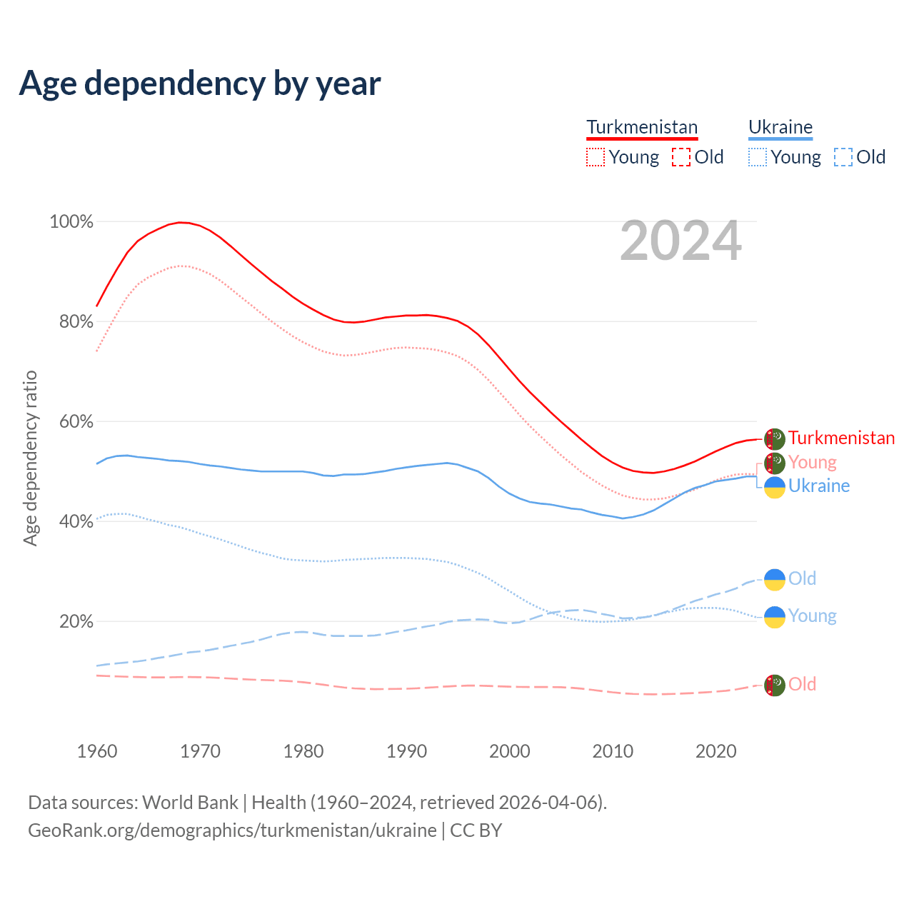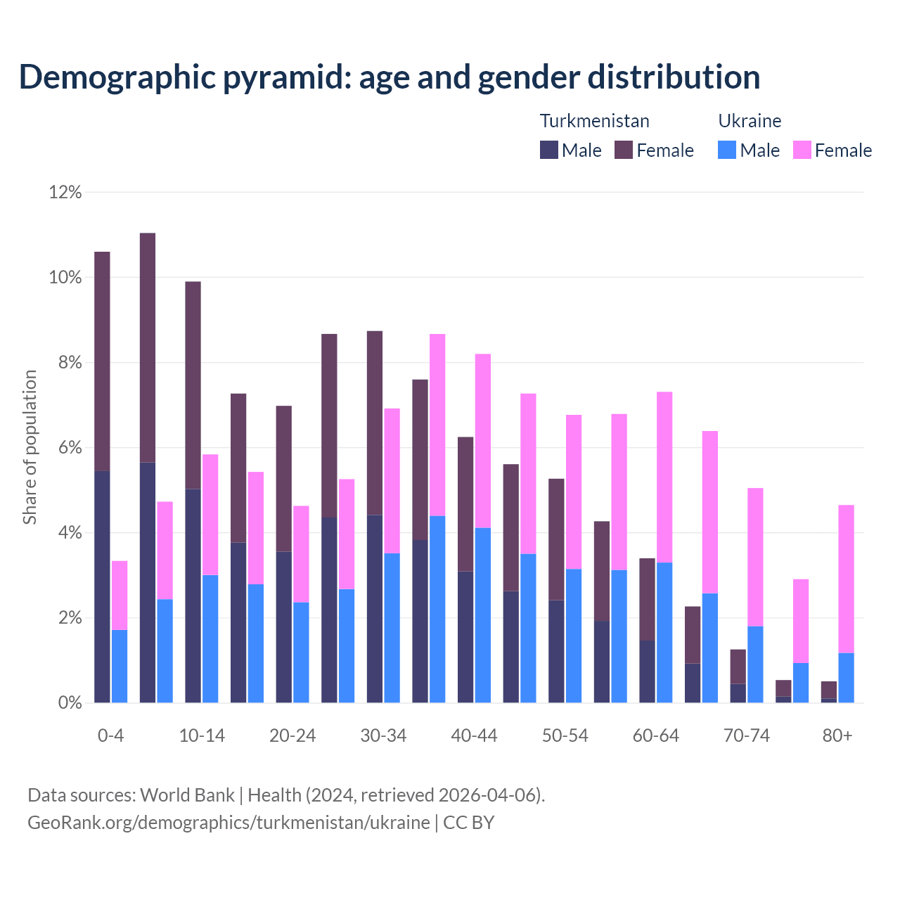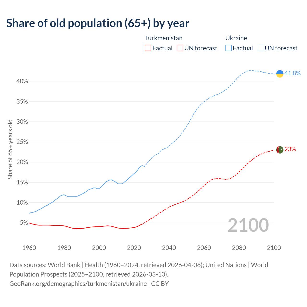 The share of older people aged 65 and over is 4.53% in Turkmenistan and 19% in Ukraine. Life expectancy in Turkmenistan compared to Ukraine .