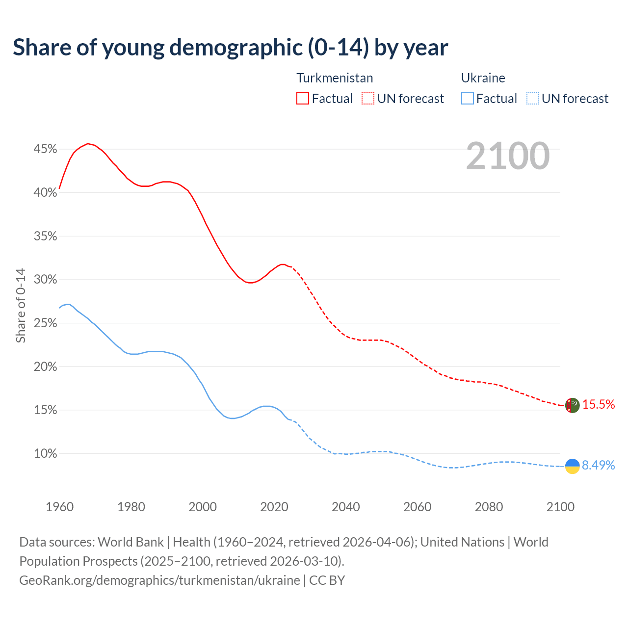 - The share of young demographic (0-15 years old) in Turkmenistan is 31.5% vs 13.9% in Ukraine.