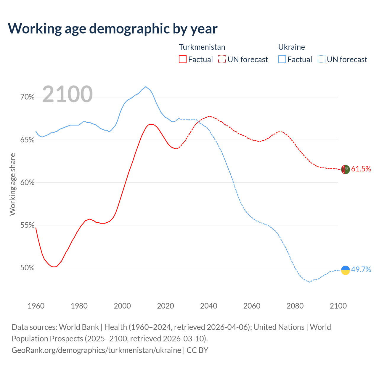 - Turkmenistan has 4.97M working age adults (aged 15-64) vs 26.9M in Ukraine.