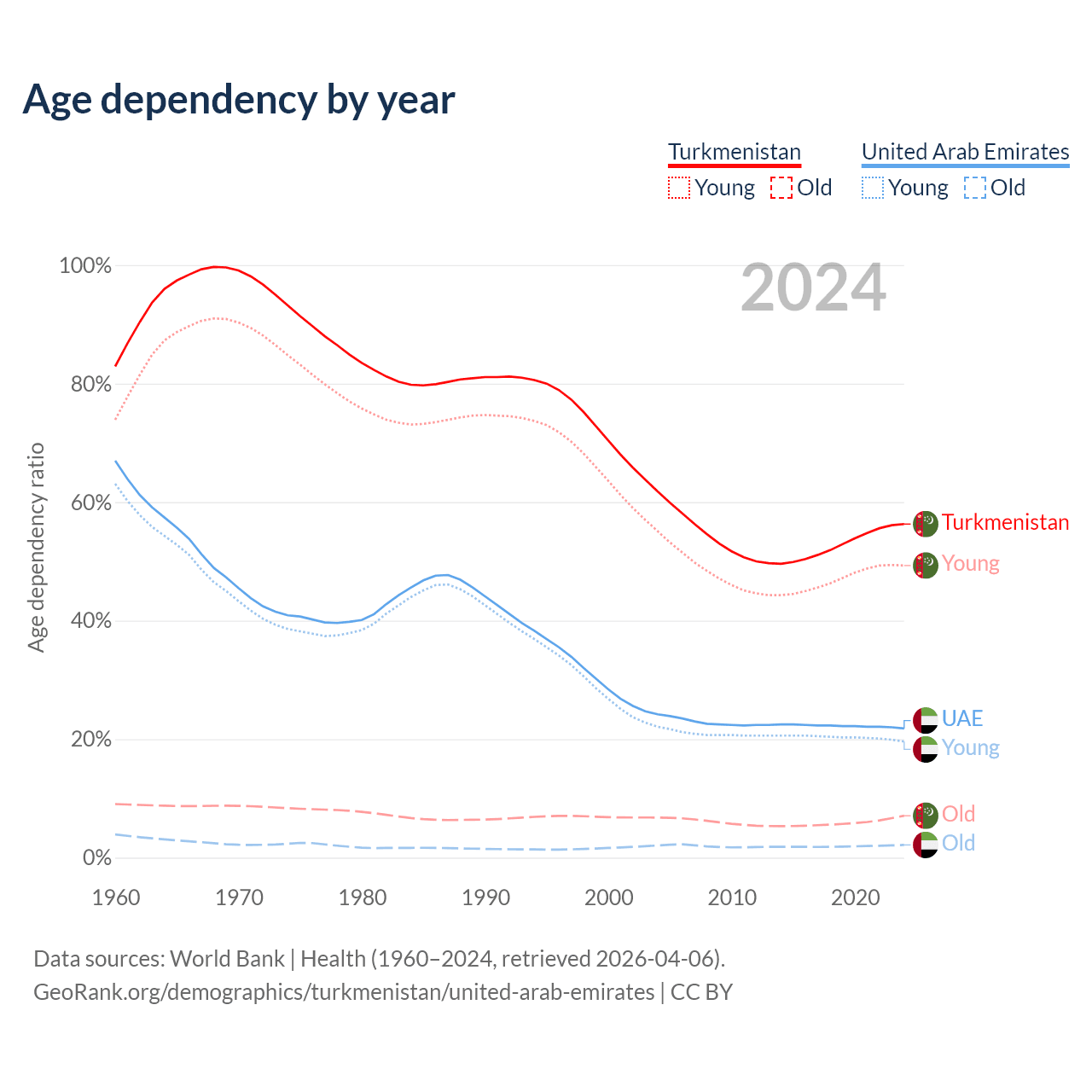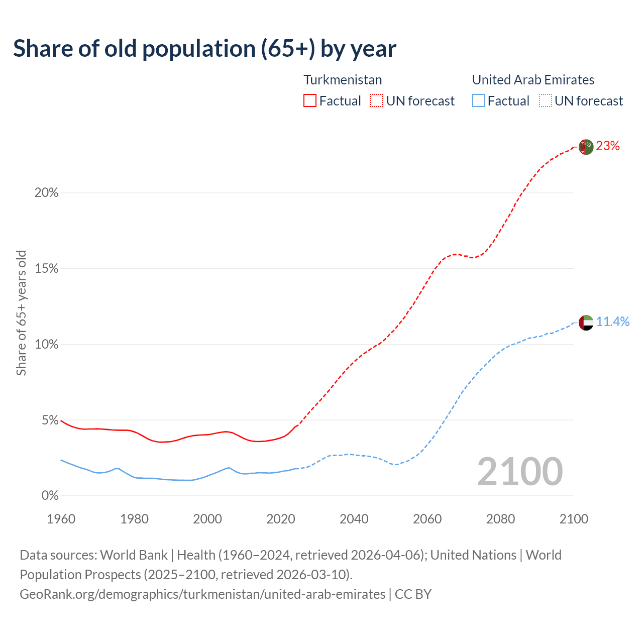 - The share of old-age demographic (65+) in Turkmenistan is 4.53% vs 1.77% in the United Arab Emirates.