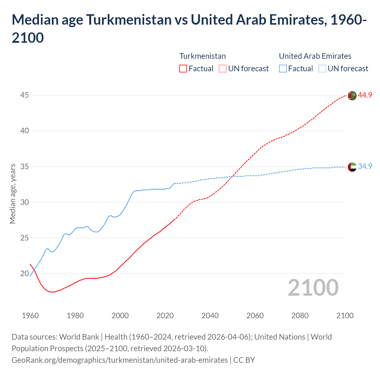 - Turkmenistan is ranked 119/196 by median age (oldest to youngest) vs 91/196 for the United Arab Emirates.