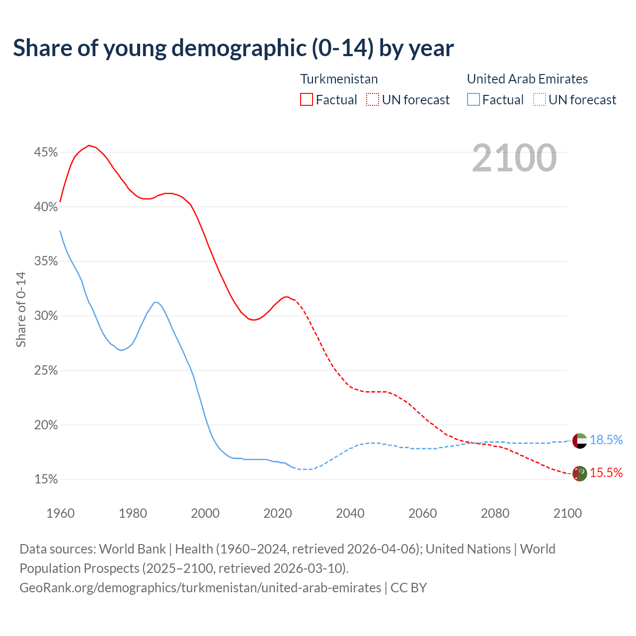- The share of young demographic (0-15 years old) in Turkmenistan is 31.5% vs 16.1% in the United Arab Emirates.