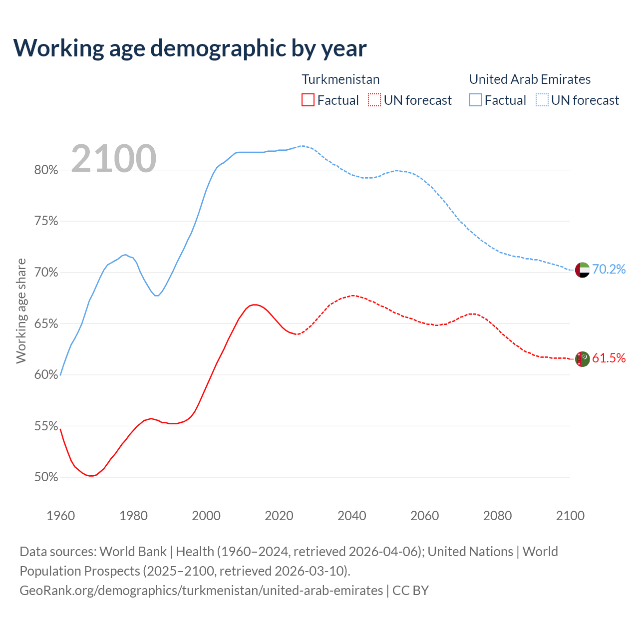 - Turkmenistan has 4.97M working age adults (aged 15-64) vs 9.6M in the United Arab Emirates.