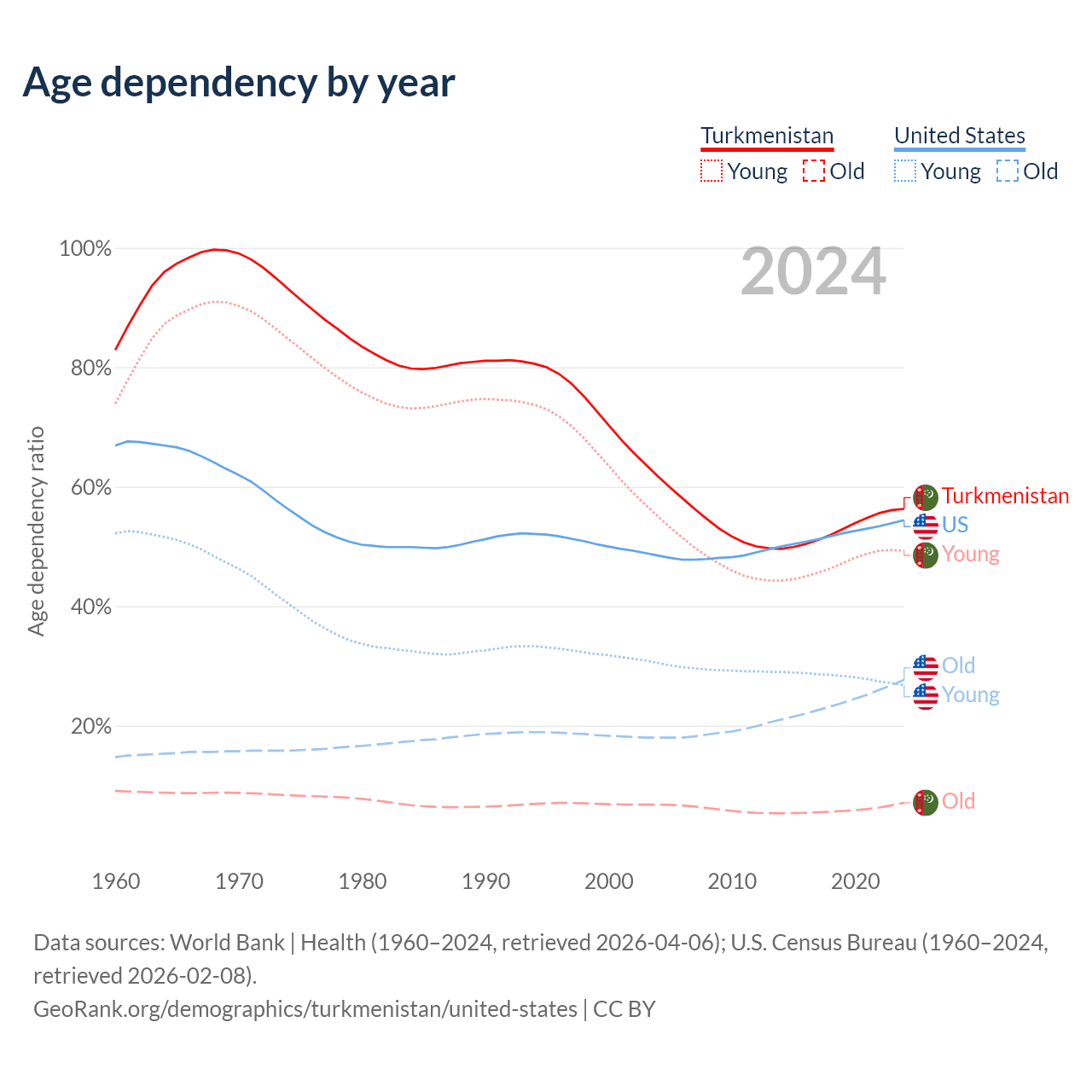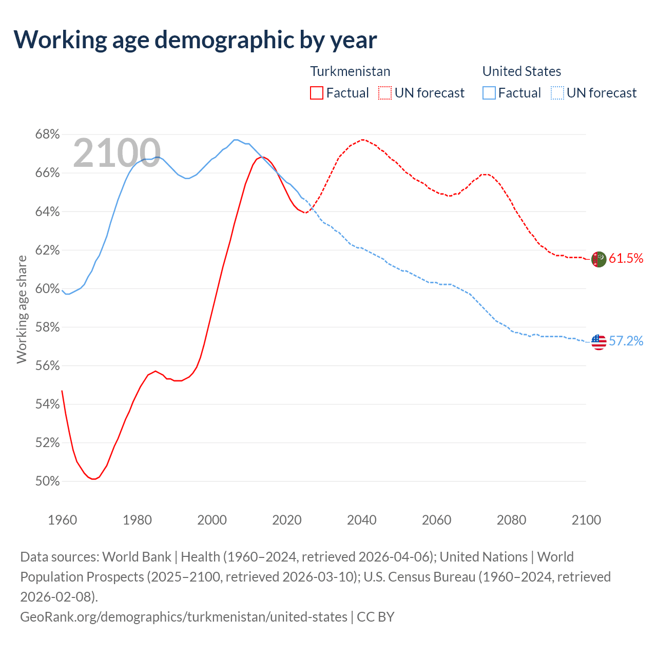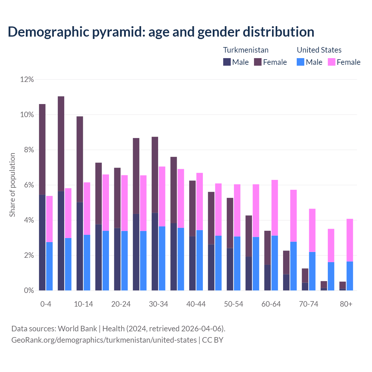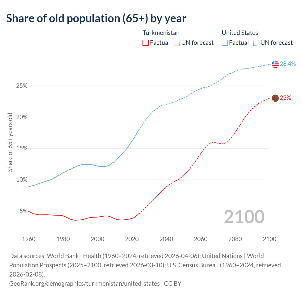 - The share of old-age demographic (65+) in Turkmenistan is 4.53% vs 17.9% in the United States.
