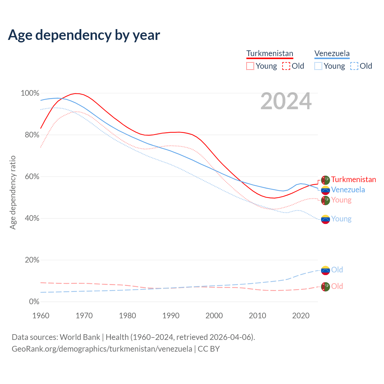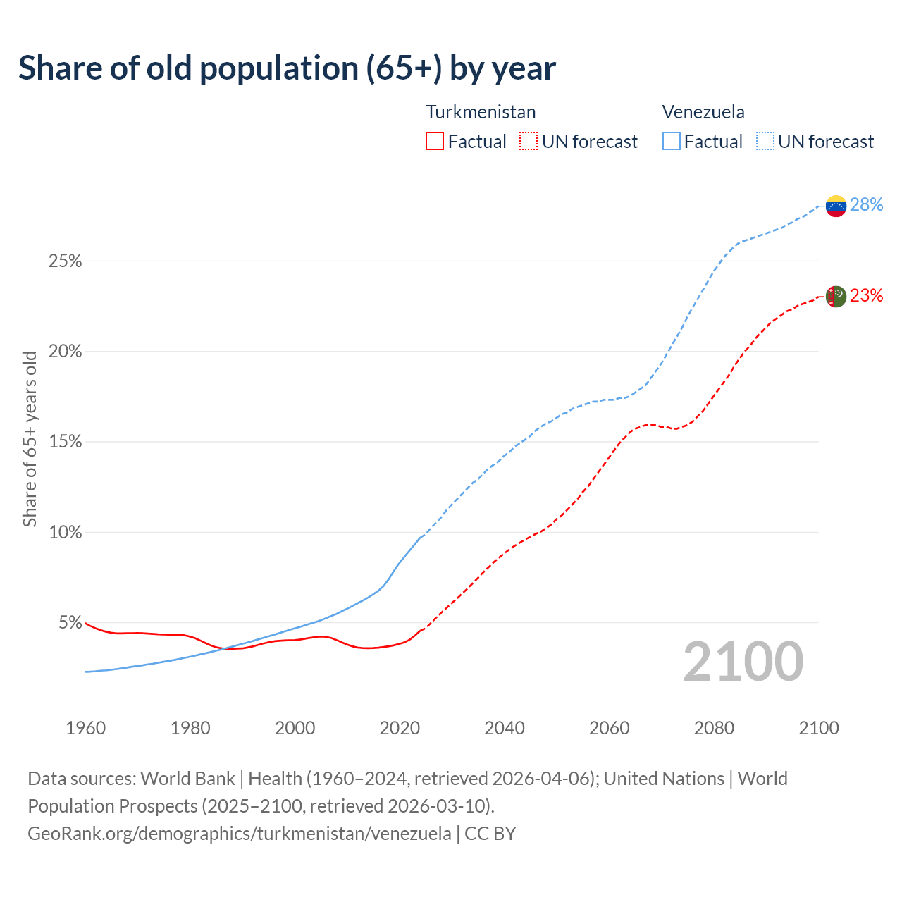- The share of old-age demographic (65+) in Turkmenistan is 4.53% vs 9.68% in Venezuela.