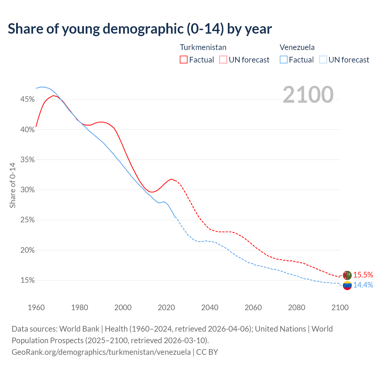 - The share of young demographic (0-15 years old) in Turkmenistan is 31.5% vs 25.5% in Venezuela.
