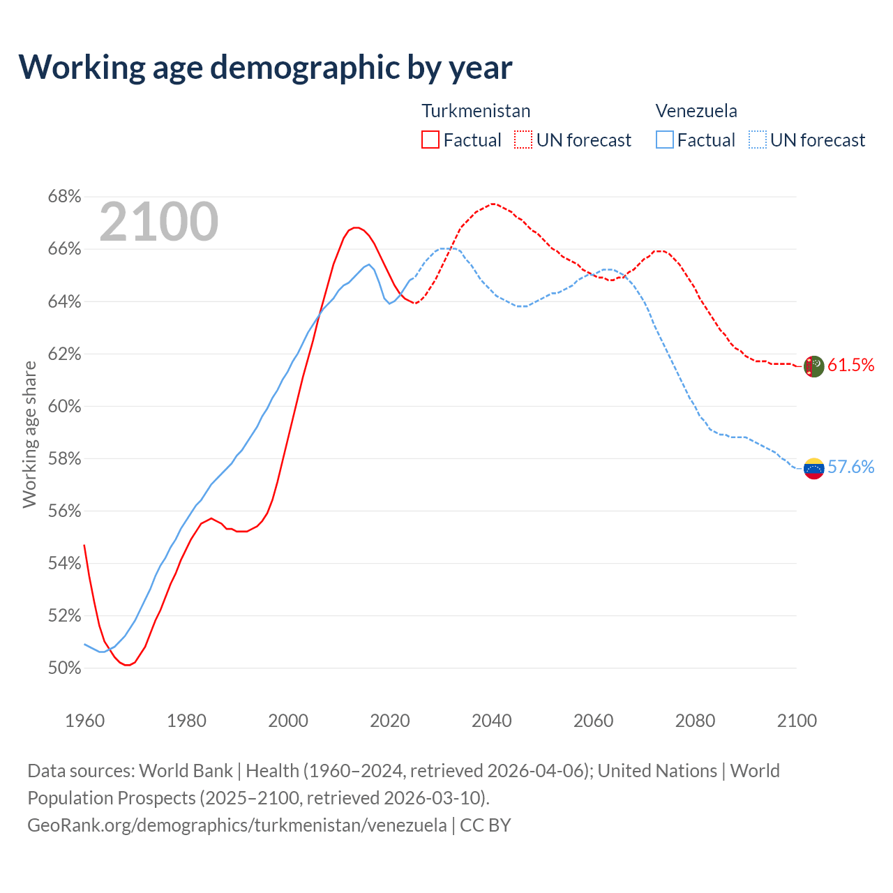 - Turkmenistan has 4.97M working age adults (aged 15-64) vs 18.6M in Venezuela.
