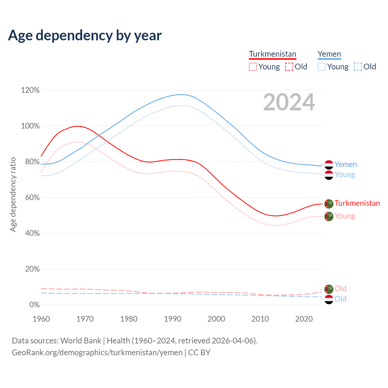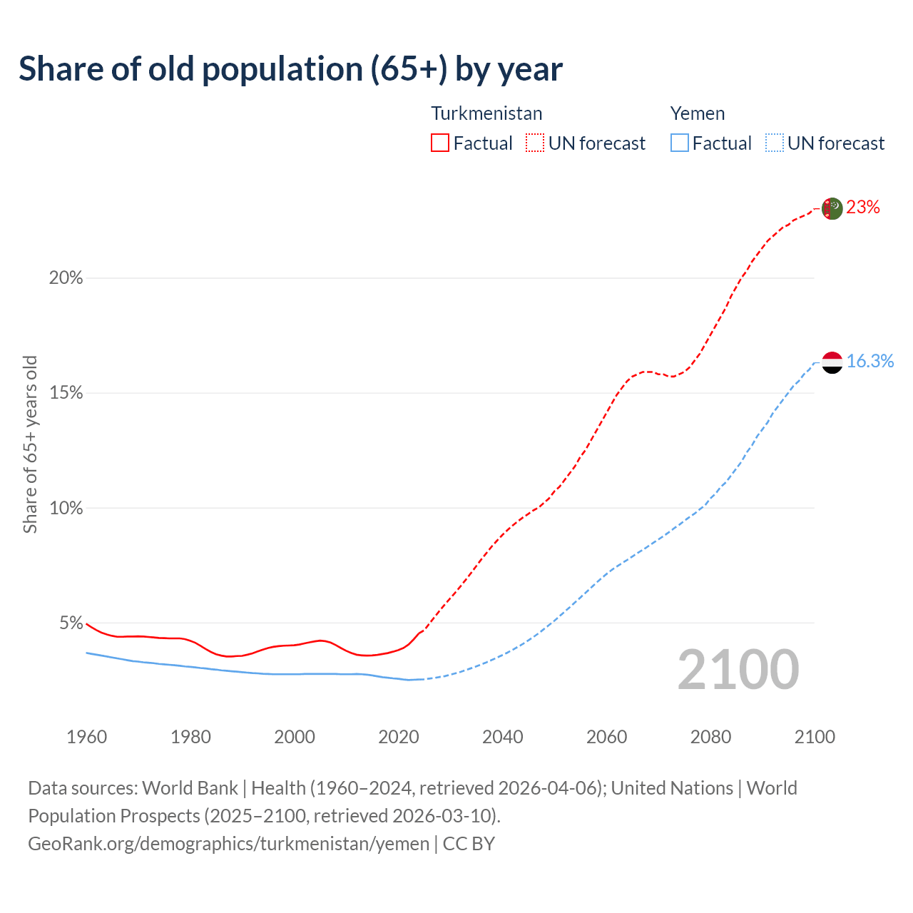 The share of older people aged 65 and over is 4.53% in Turkmenistan and 2.52% in Yemen. Life expectancy in Turkmenistan compared to Yemen .