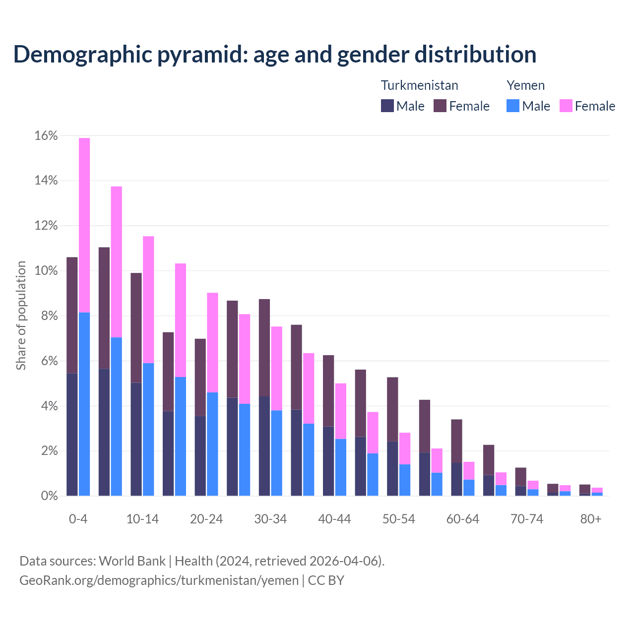 - The share of old-age demographic (65+) in Turkmenistan is 4.53% vs 2.52% in Yemen.