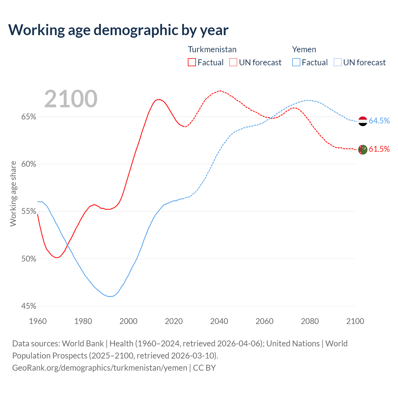 - Turkmenistan has 4.97M working age adults (aged 15-64) vs 24.4M in Yemen.