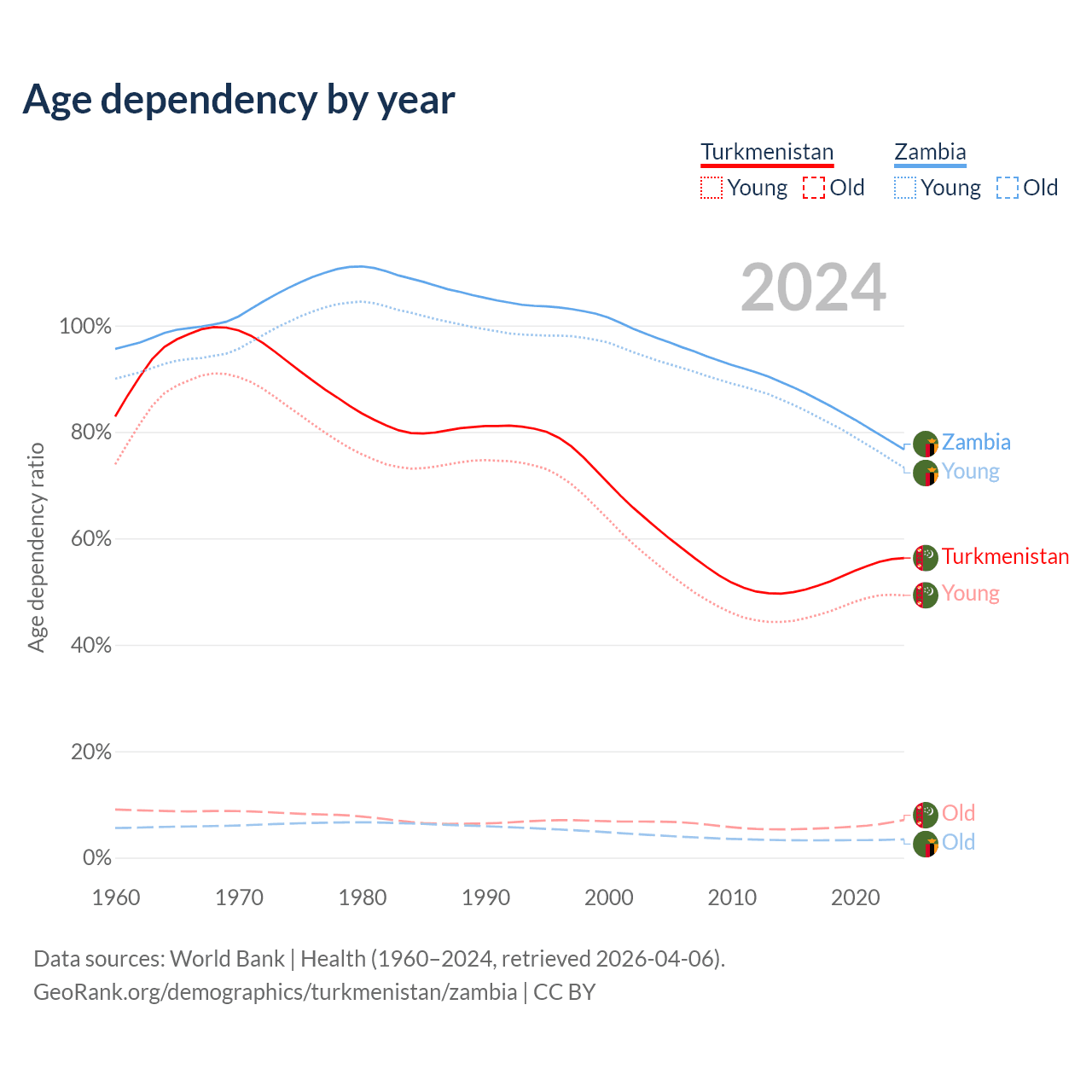 - The share of old-age demographic (65+) in Turkmenistan is 4.53% vs 1.95% in Zambia.