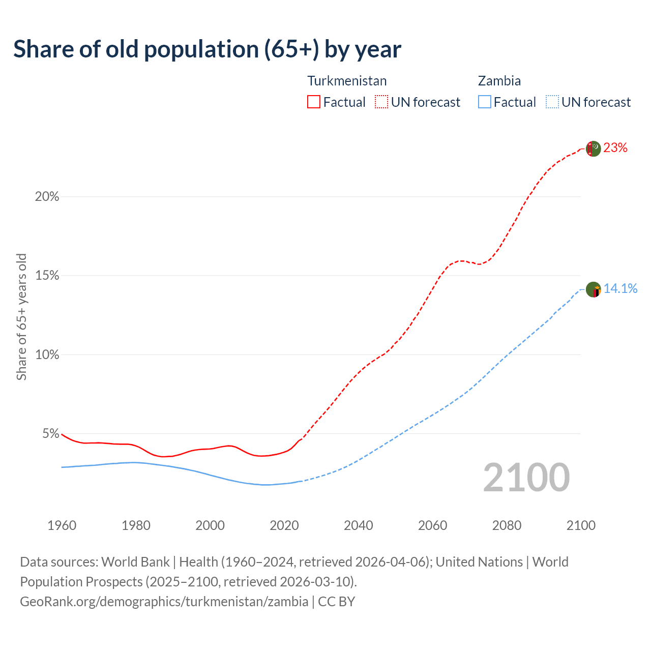 The share of older people aged 65 and over is 4.53% in Turkmenistan and 1.95% in Zambia. Life expectancy in Turkmenistan compared to Zambia .
