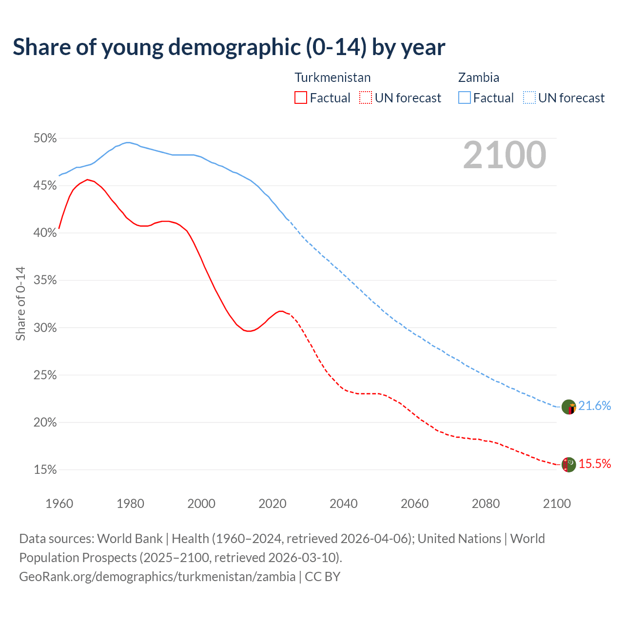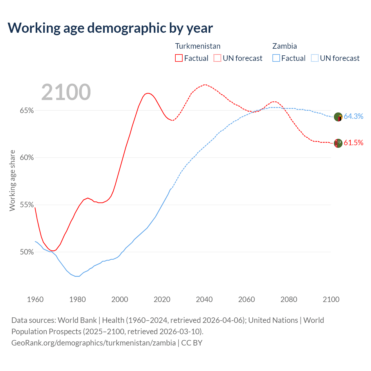 Median age Turkmenistan vs Zambia, 1960-2100