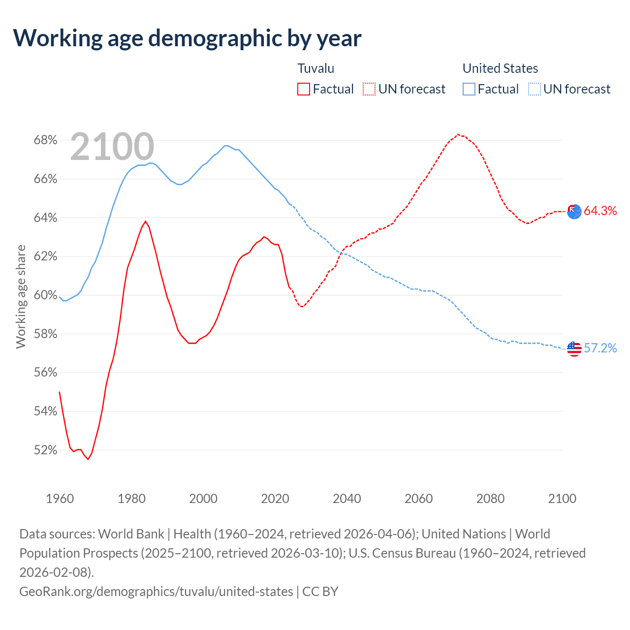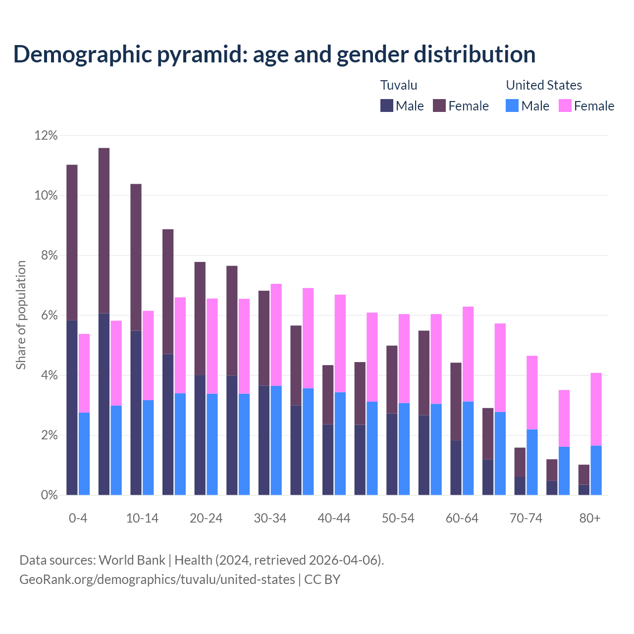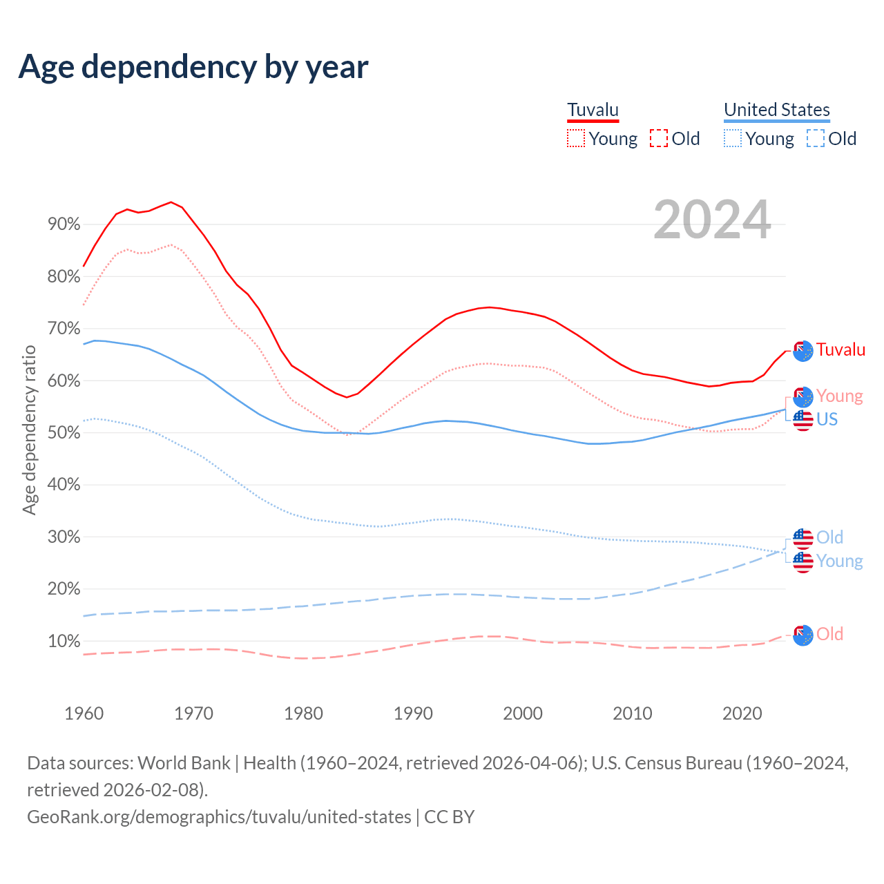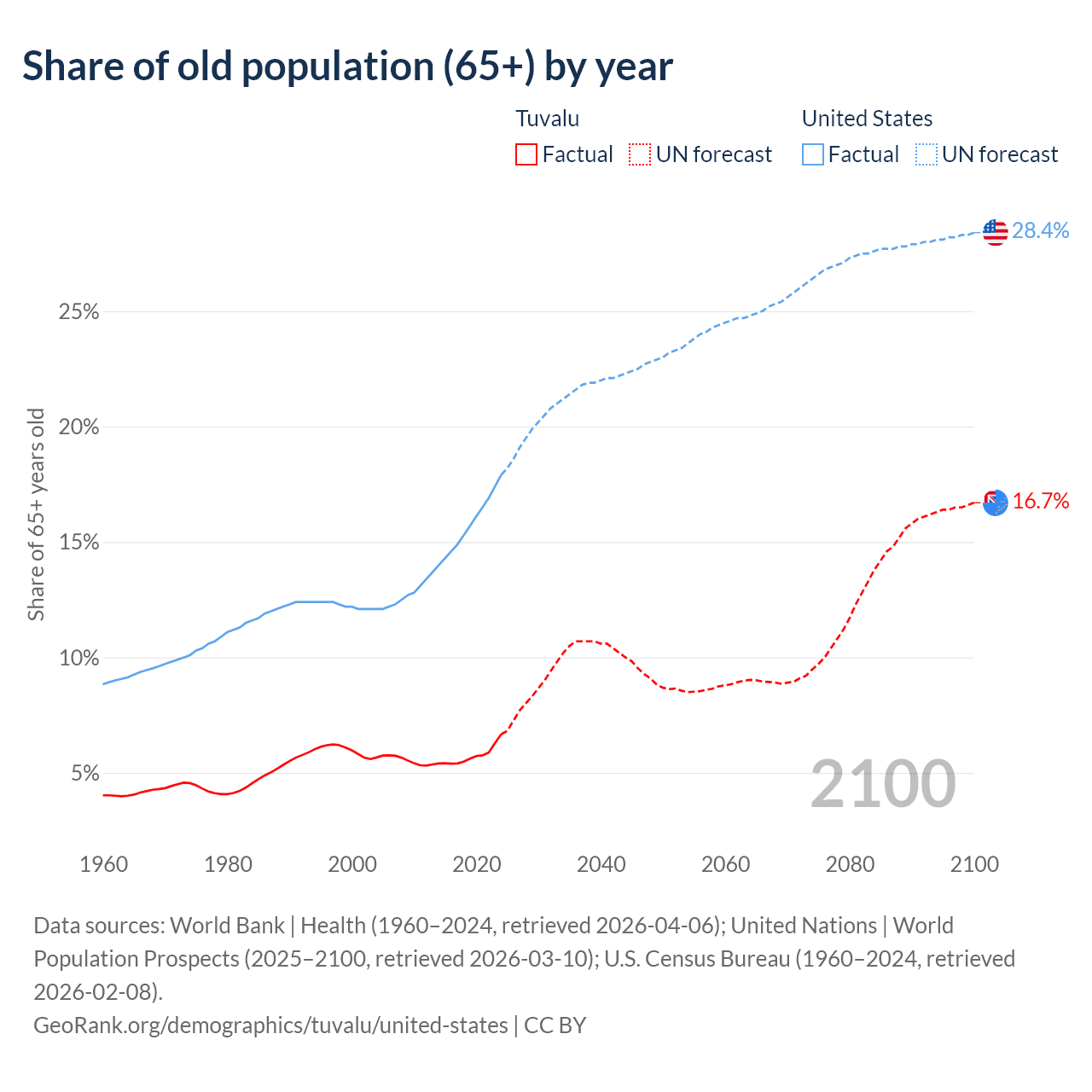 - The share of old-age demographic (65+) in Tuvalu is 6.67% vs 17.9% in the United States.
