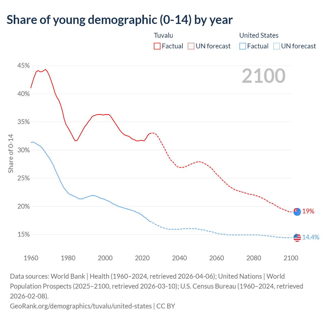 - The share of young demographic (0-15 years old) in Tuvalu is 32.9% vs 17.3% in the United States.