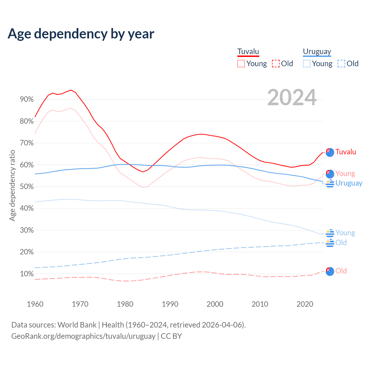 - The share of old-age demographic (65+) in Tuvalu is 6.67% vs 16% in Uruguay.