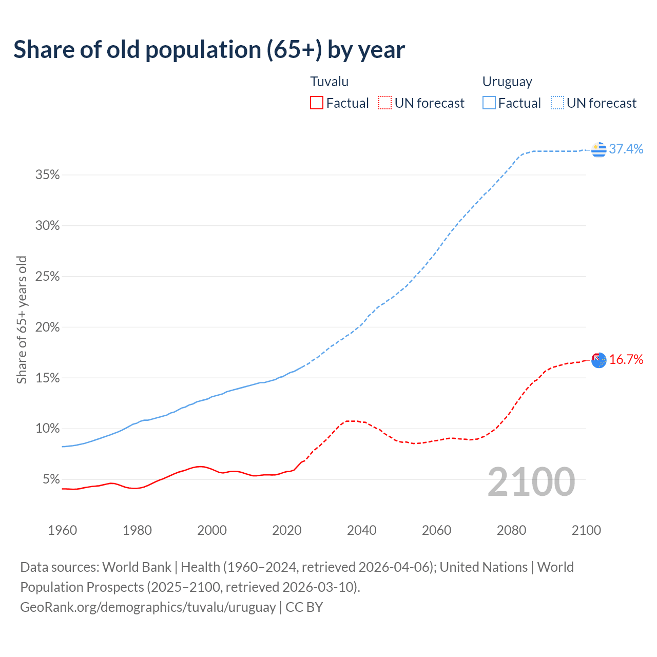 The share of older people aged 65 and over is 6.67% in Tuvalu and 16% in Uruguay. Life expectancy in Tuvalu compared to Uruguay .