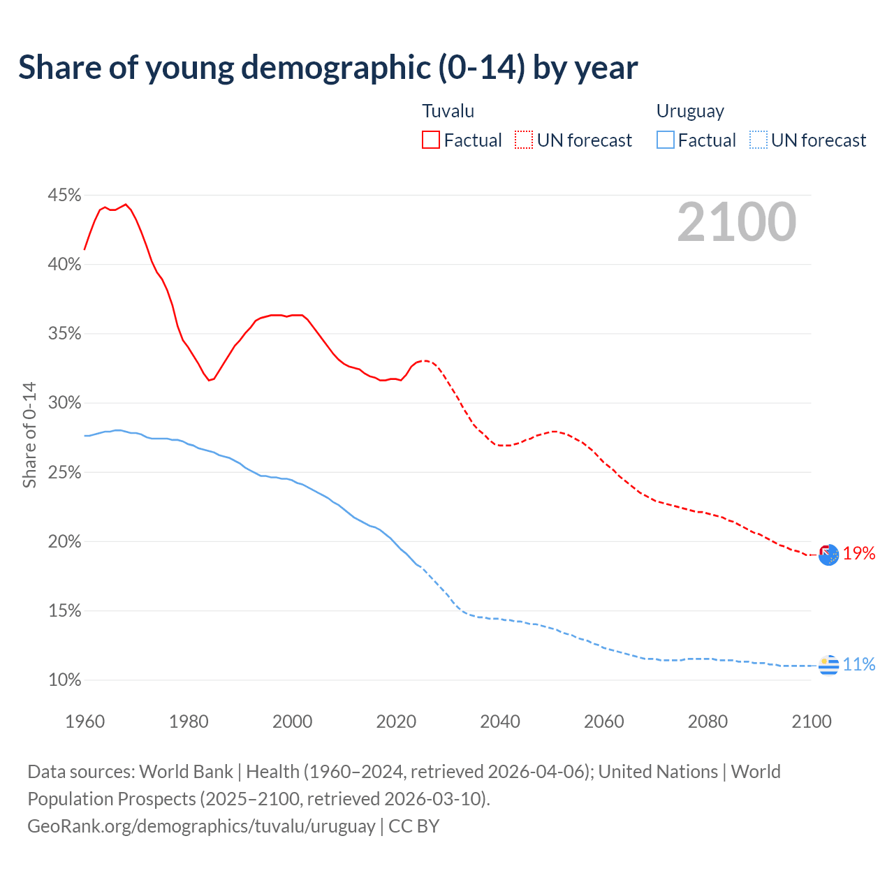 - The share of young demographic (0-15 years old) in Tuvalu is 32.9% vs 18.3% in Uruguay.
