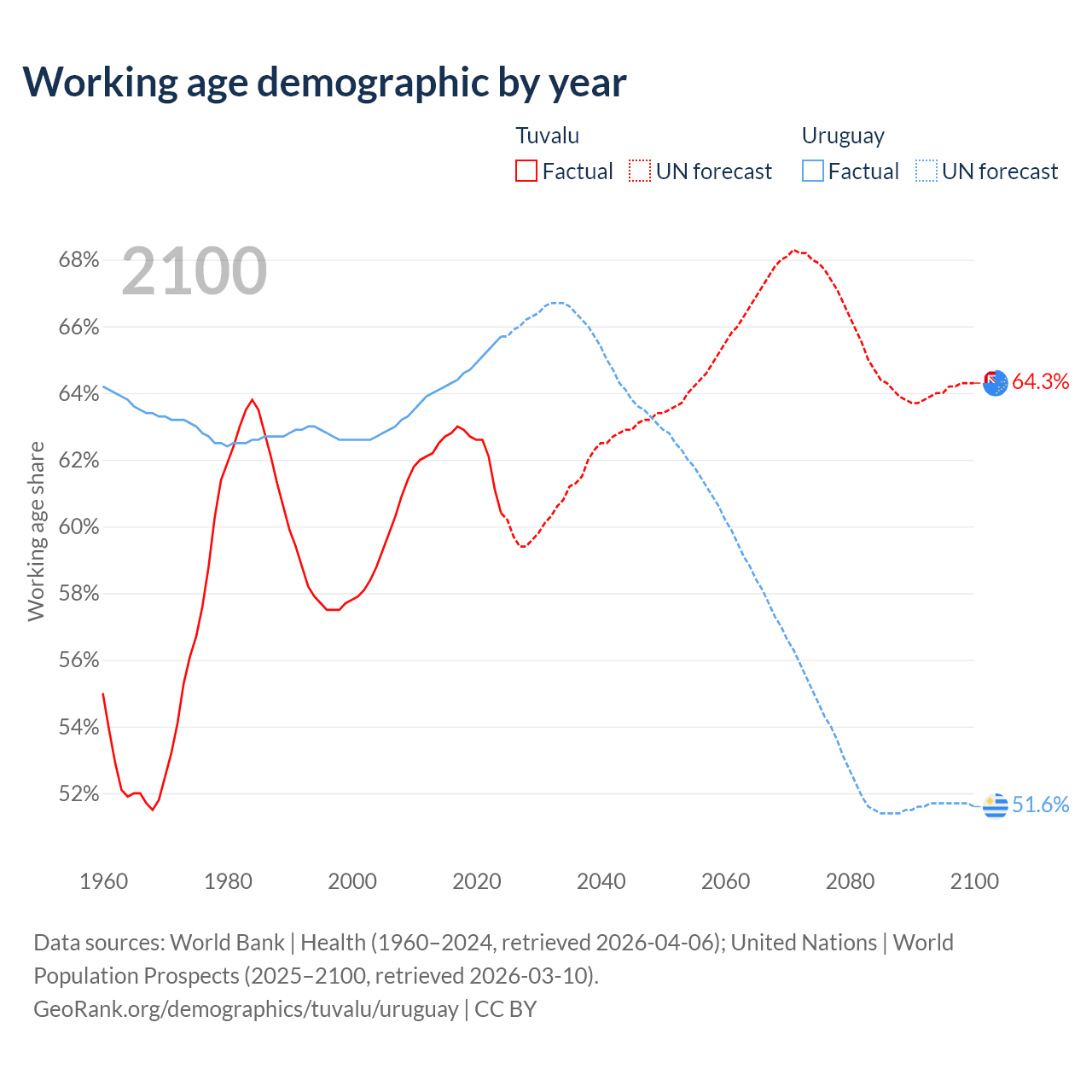- Tuvalu has 5.64K working age adults (aged 15-64) vs 2.22M in Uruguay.
