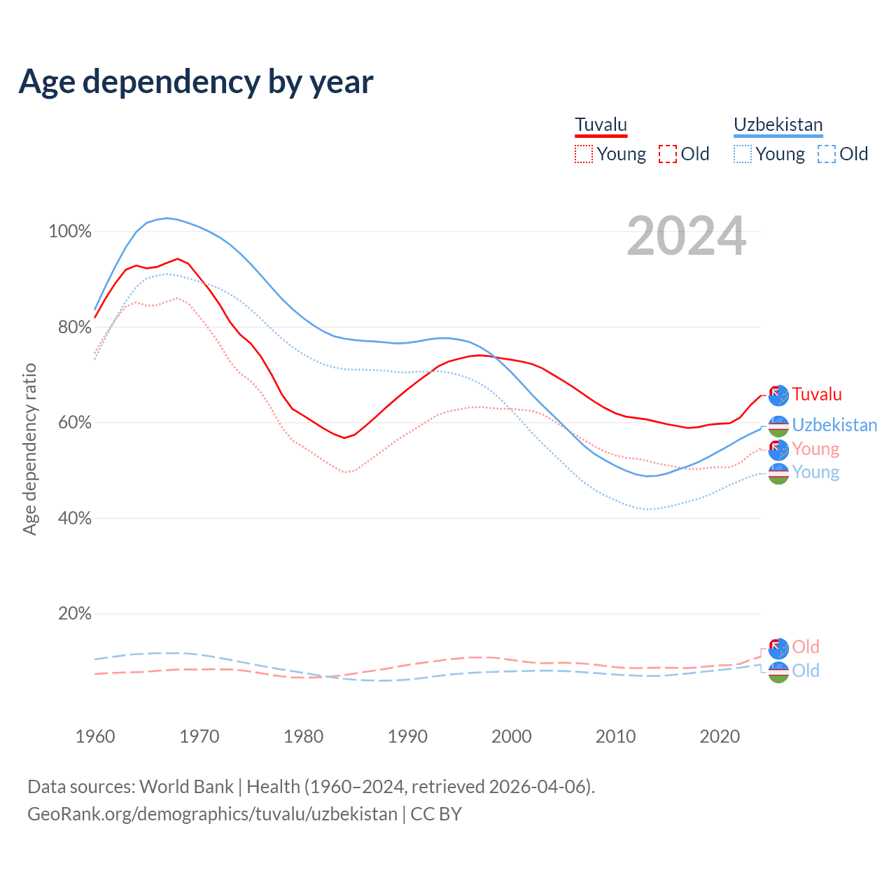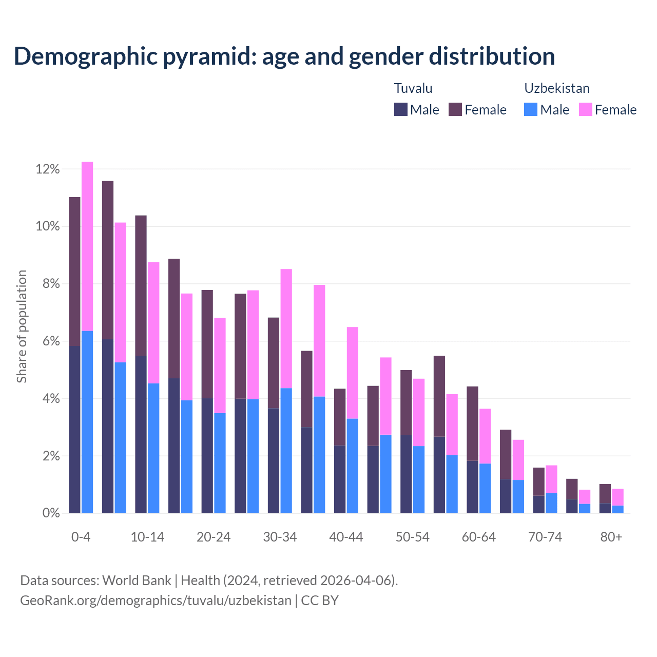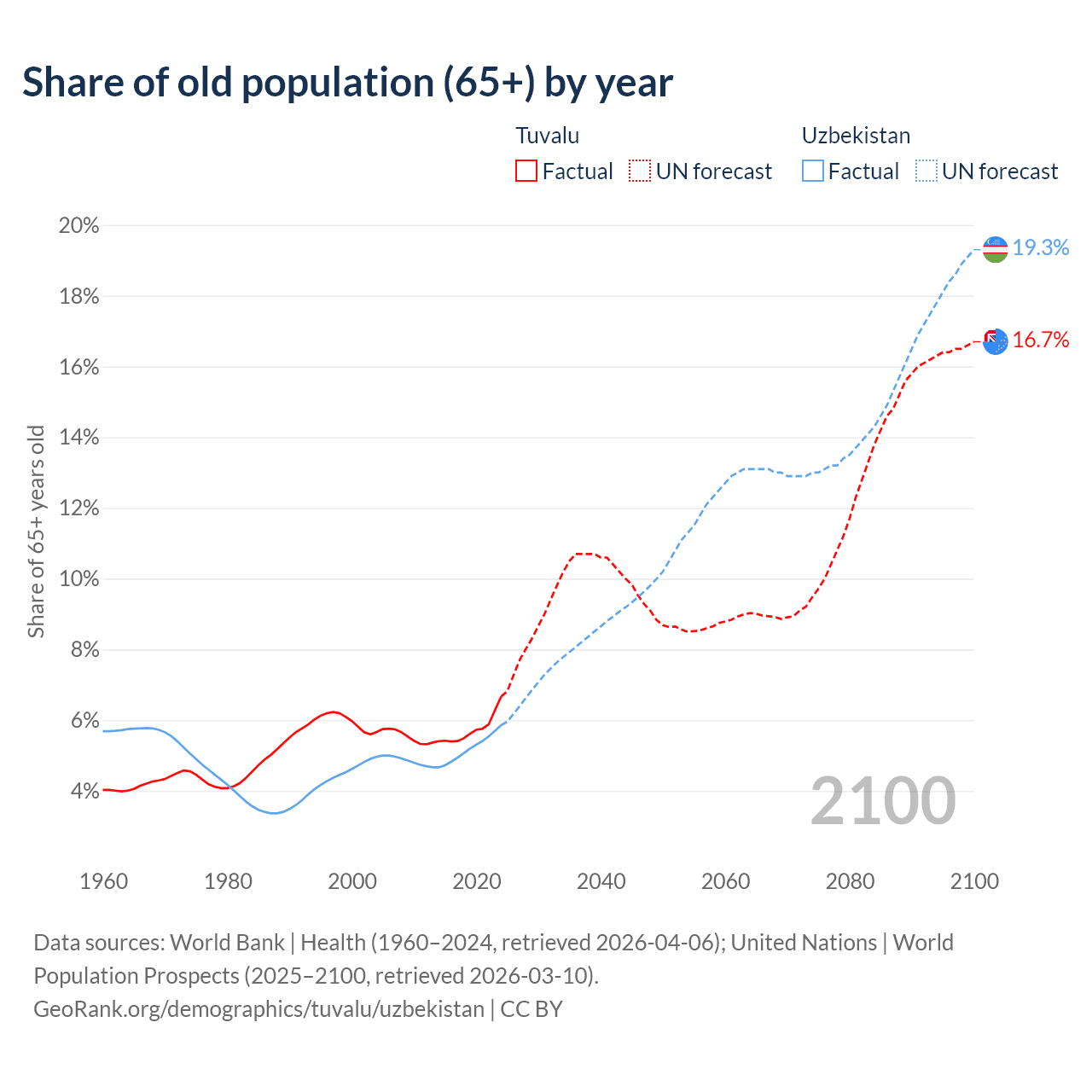 - The share of old-age demographic (65+) in Tuvalu is 6.67% vs 5.86% in Uzbekistan.