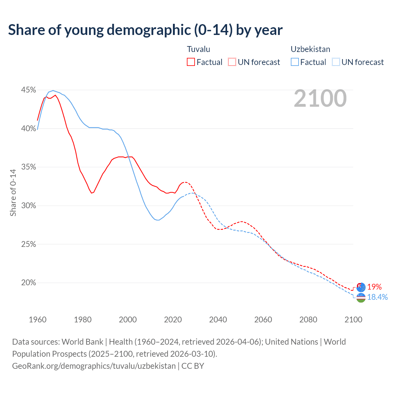 - The share of young demographic (0-15 years old) in Tuvalu is 32.9% vs 31.1% in Uzbekistan.