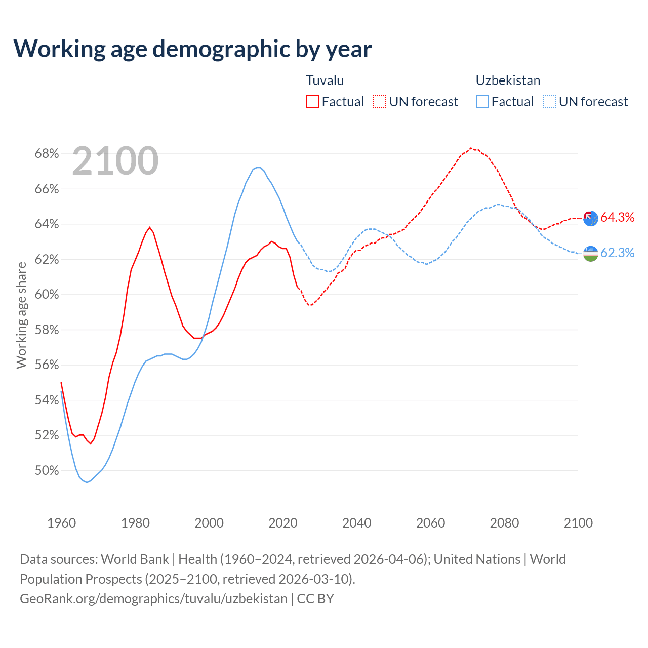 - Tuvalu has 5.64K working age adults (aged 15-64) vs 23.9M in Uzbekistan.