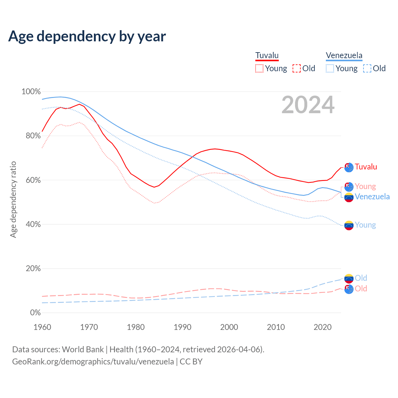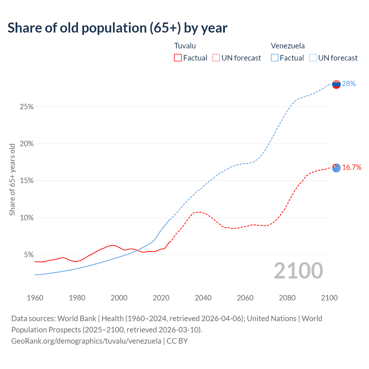 - The share of old-age demographic (65+) in Tuvalu is 6.67% vs 9.68% in Venezuela.