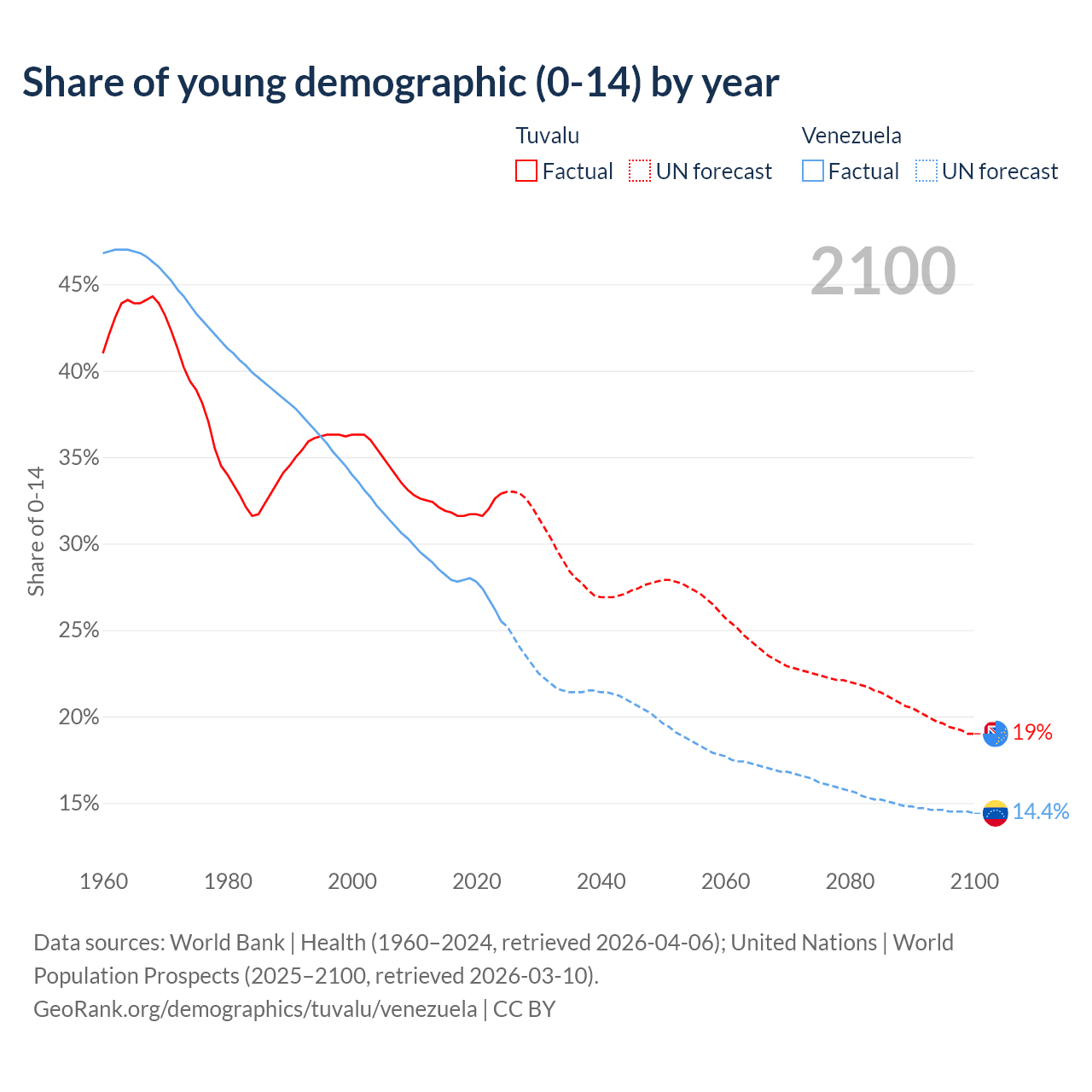 - The share of young demographic (0-15 years old) in Tuvalu is 32.9% vs 25.5% in Venezuela.