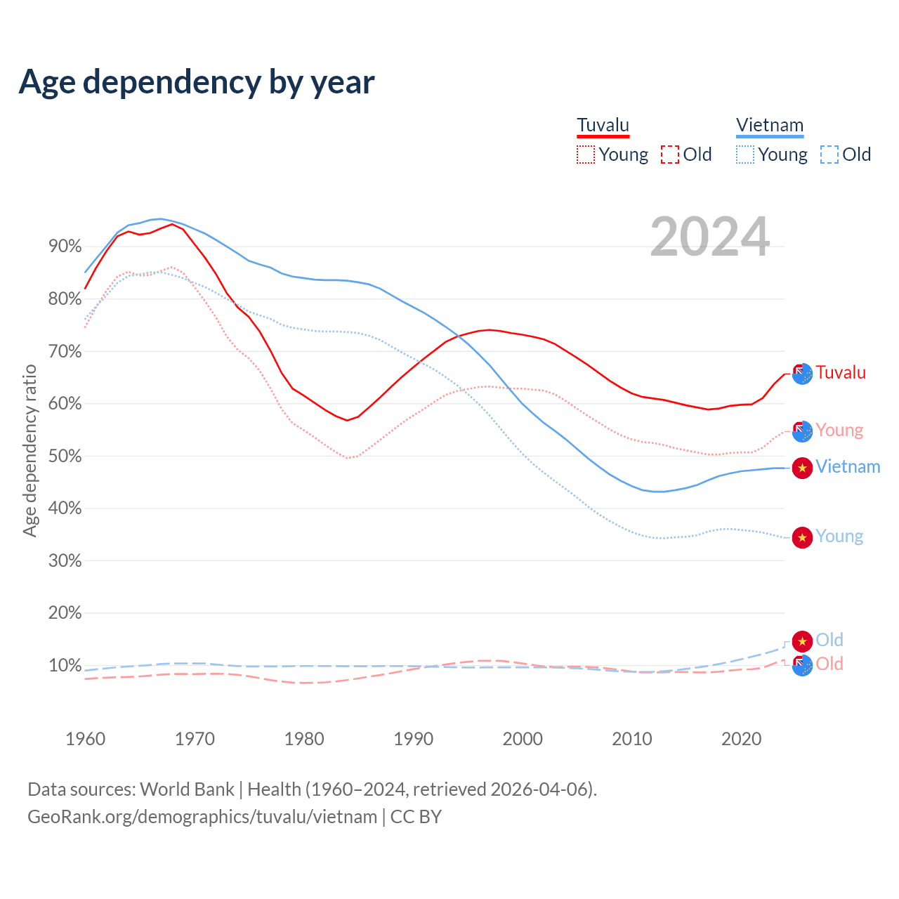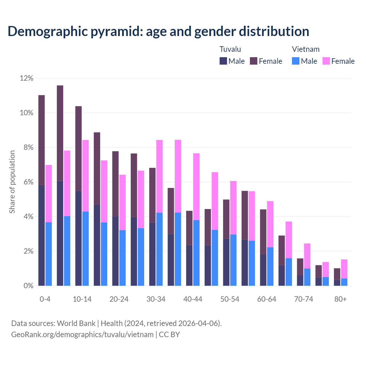 - Tuvalu is ranked 132/196 by median age (oldest to youngest) vs 84/196 for Vietnam.