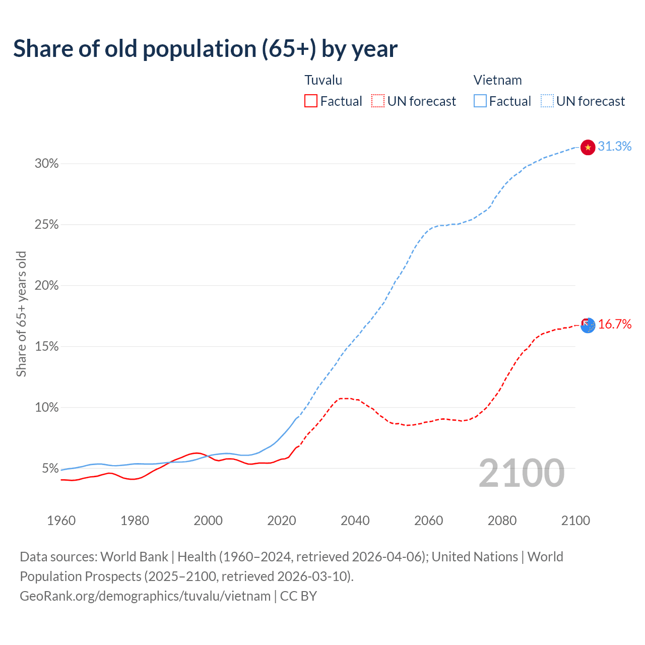 - The share of old-age demographic (65+) in Tuvalu is 6.67% vs 9.05% in Vietnam.