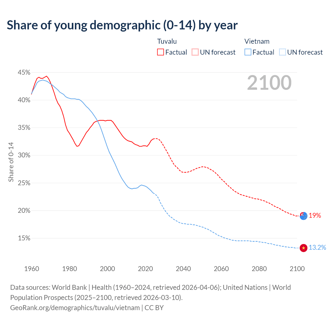 - The share of young demographic (0-15 years old) in Tuvalu is 32.9% vs 23.2% in Vietnam.