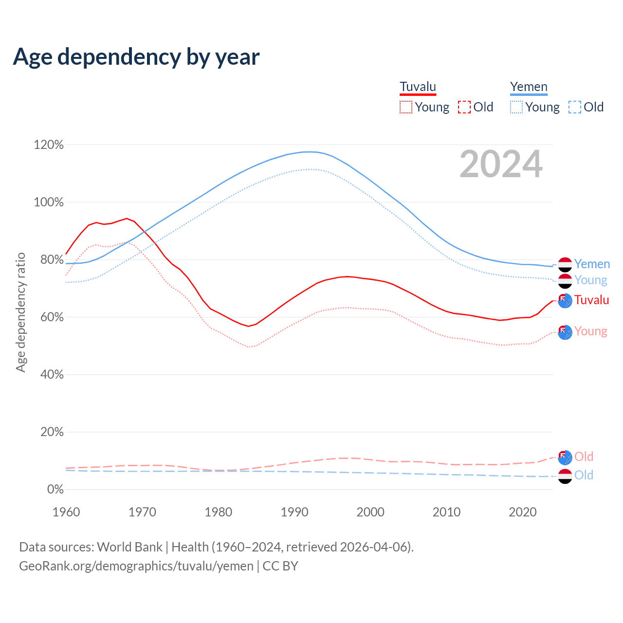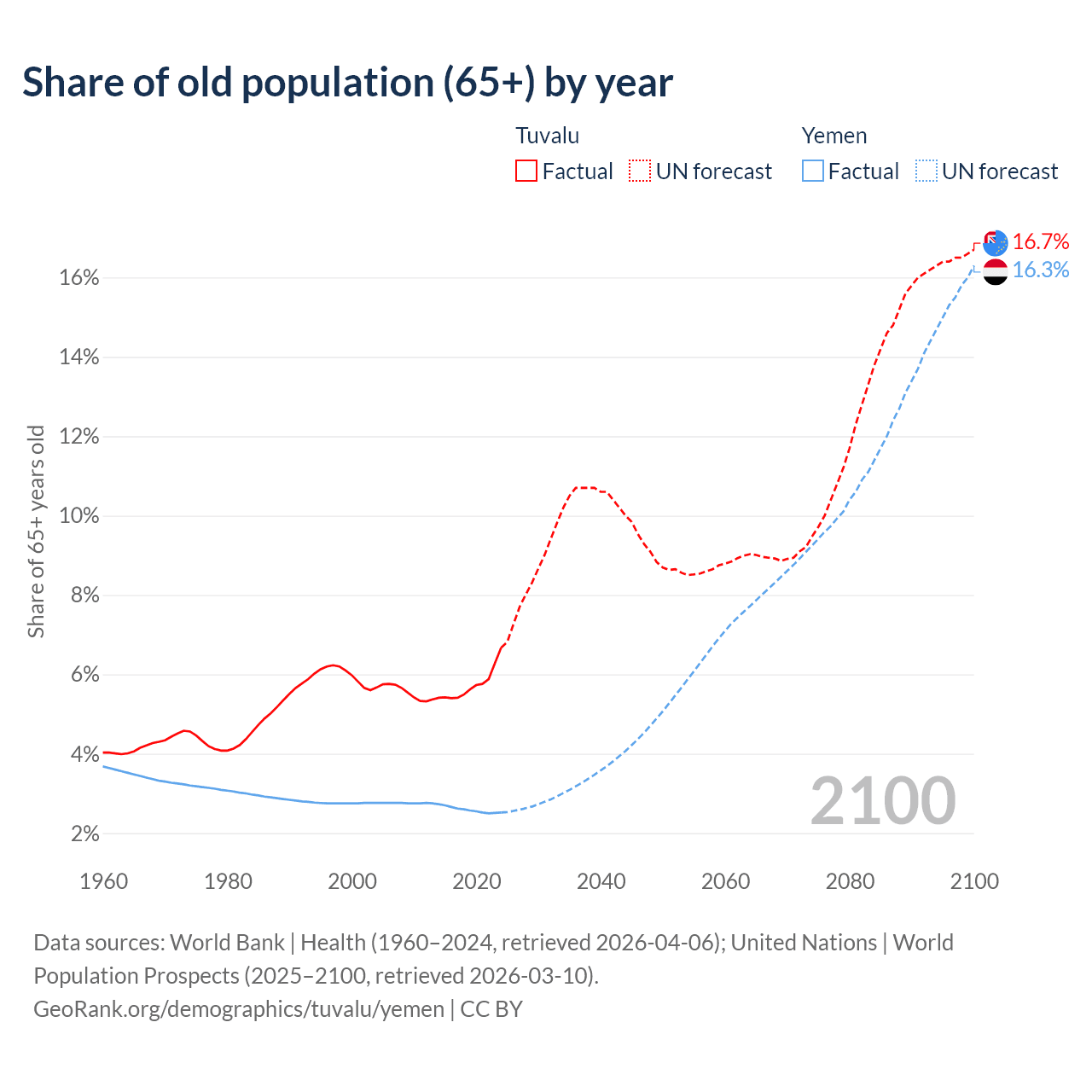 - The share of old-age demographic (65+) in Tuvalu is 6.67% vs 2.52% in Yemen.