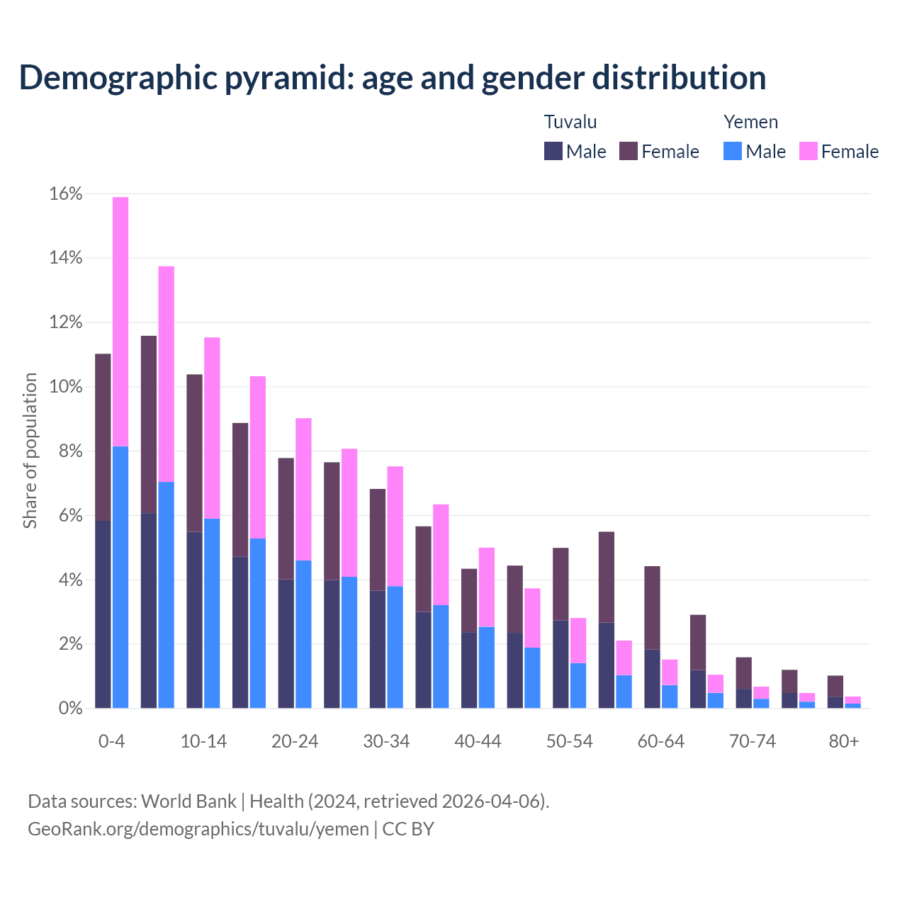 - As of 2026, the population of Tuvalu is 9.34K vs 43.3M in Yemen - 4,638 times difference.