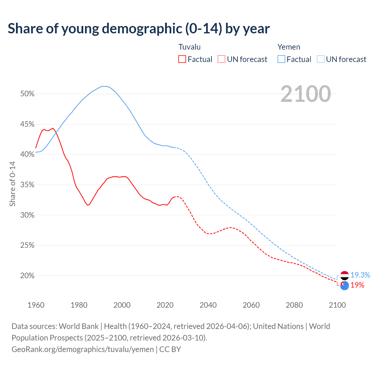 - The share of young demographic (0-15 years old) in Tuvalu is 32.9% vs 41.1% in Yemen.
