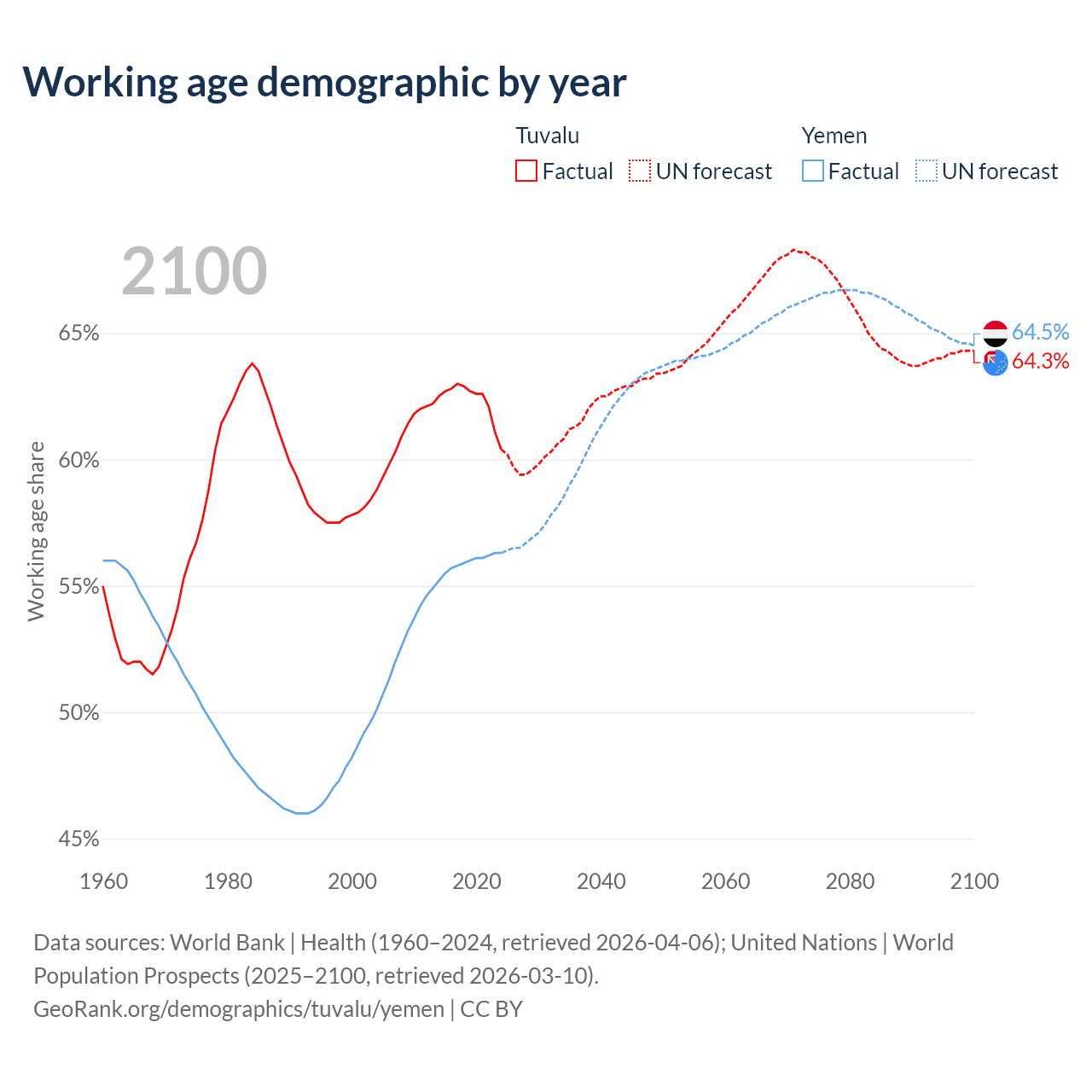 - Tuvalu has 5.64K working age adults (aged 15-64) vs 24.4M in Yemen.