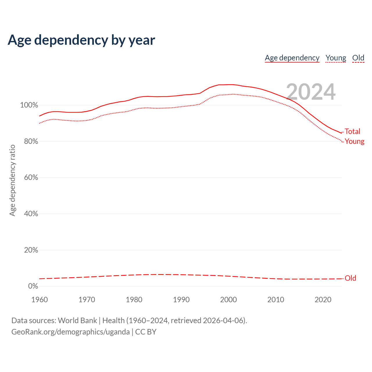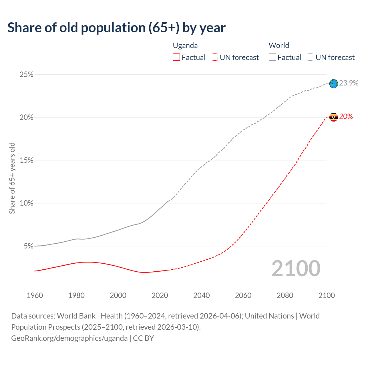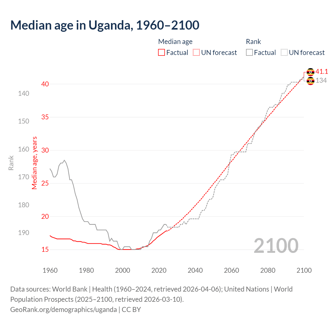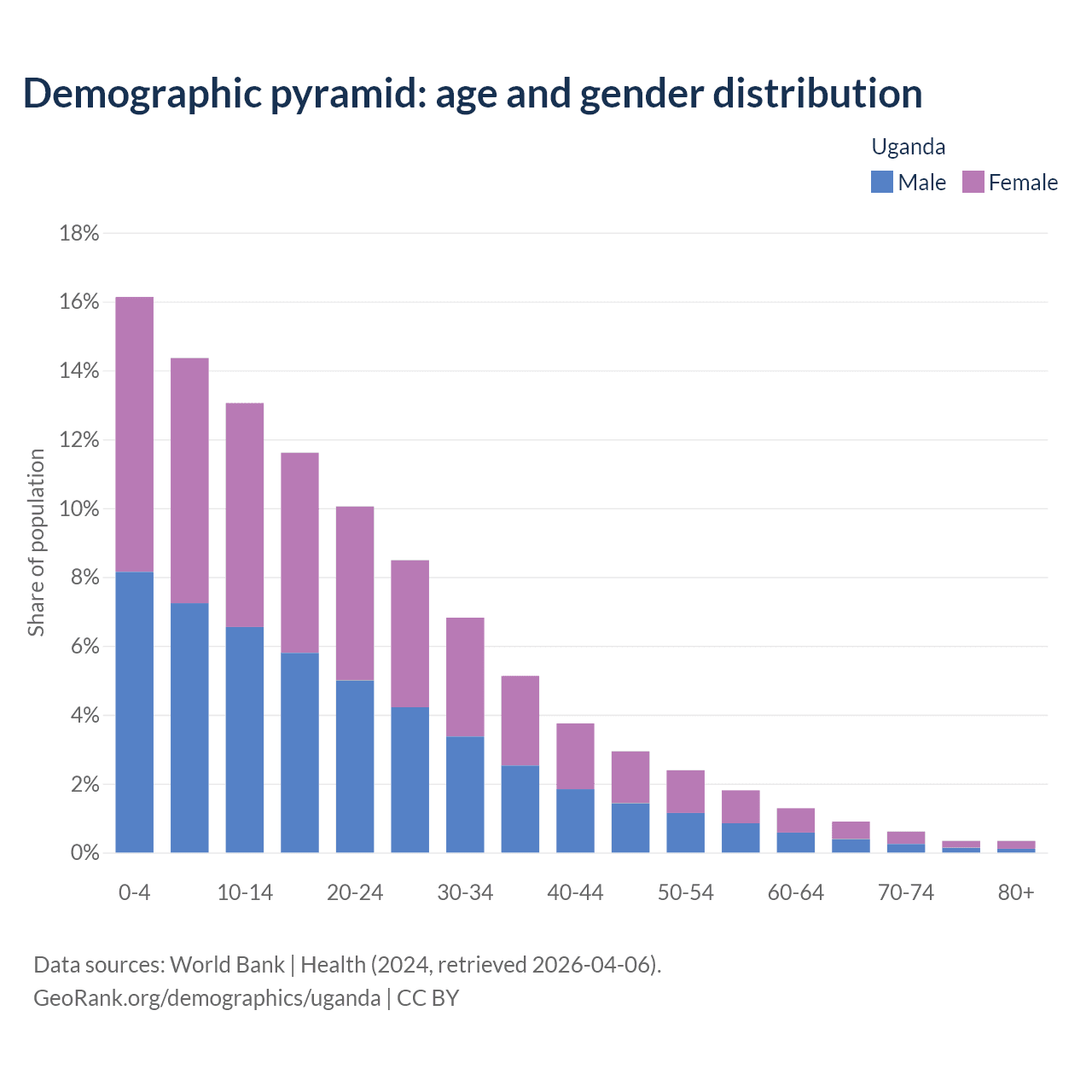 With a population of 50M people, Uganda has a median age of 17.8 years which makes it the 187/196 oldest country. 43.5% of the demographic are children 0-14 years old, 54.3% are working-age people aged 15-64, and 2.19% are older population aged 65+ years.