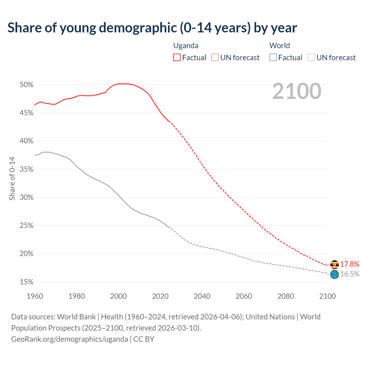 The share of children aged 0-14 in Uganda decreased from 50.1% to 43.5% between 2004 and 2024 due to changes in birth rates.
