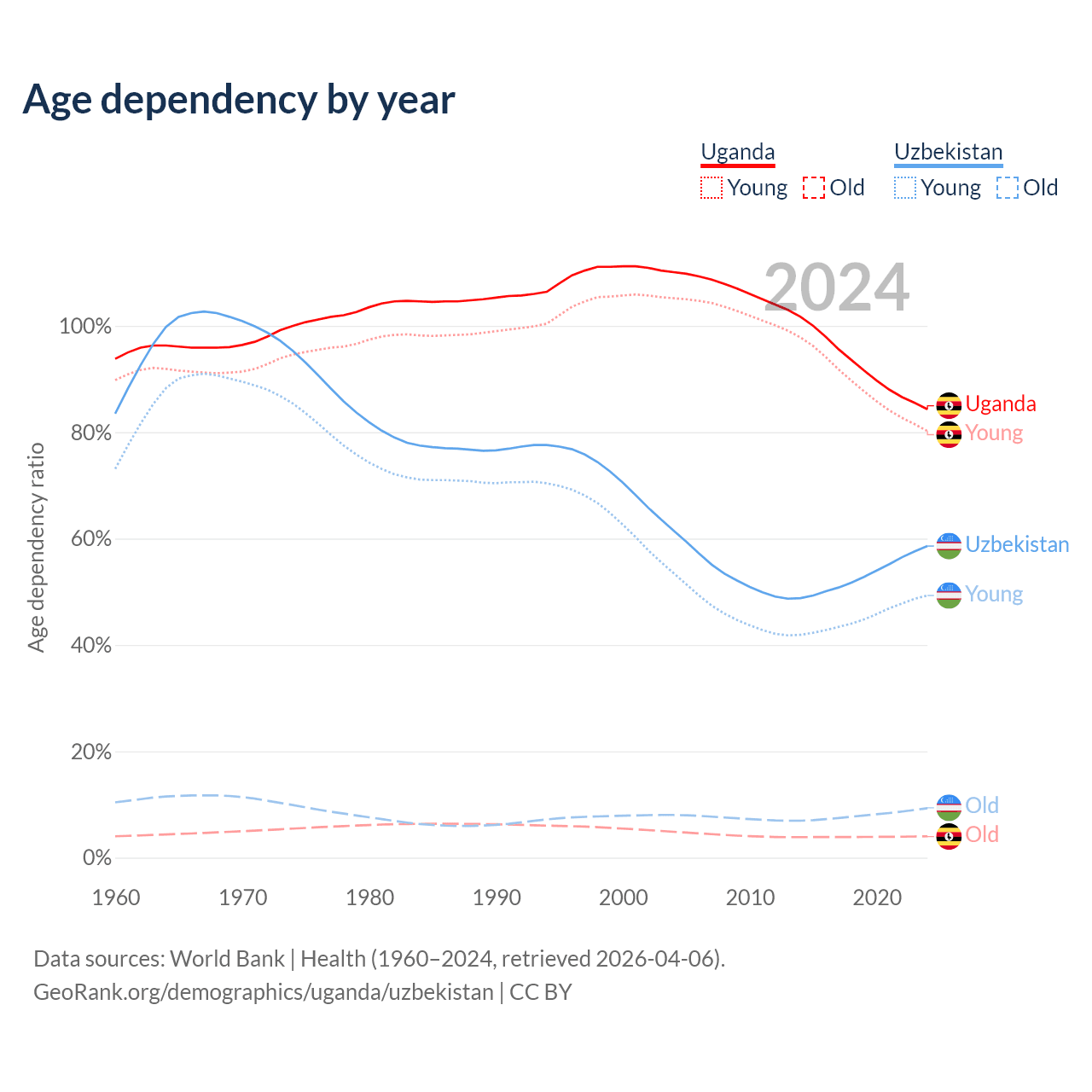 - Uganda is ranked 187/196 by median age (oldest to youngest) vs 116/196 for Uzbekistan.