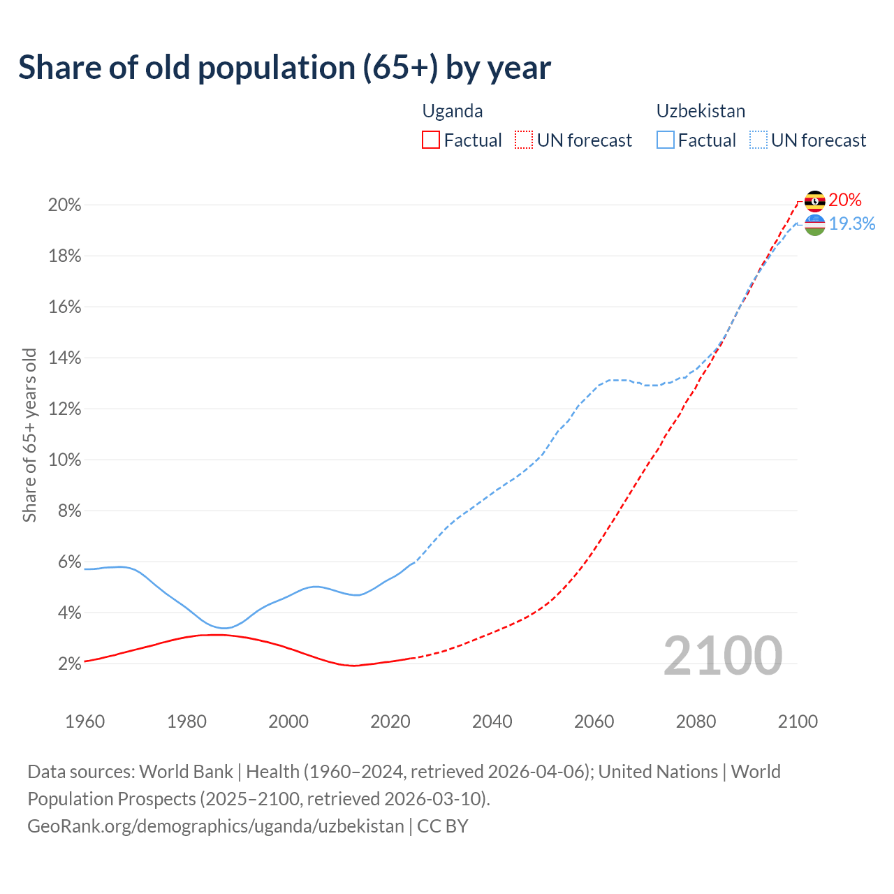 The share of older people aged 65 and over is 2.19% in Uganda and 5.86% in Uzbekistan. Life expectancy in Uganda compared to Uzbekistan .