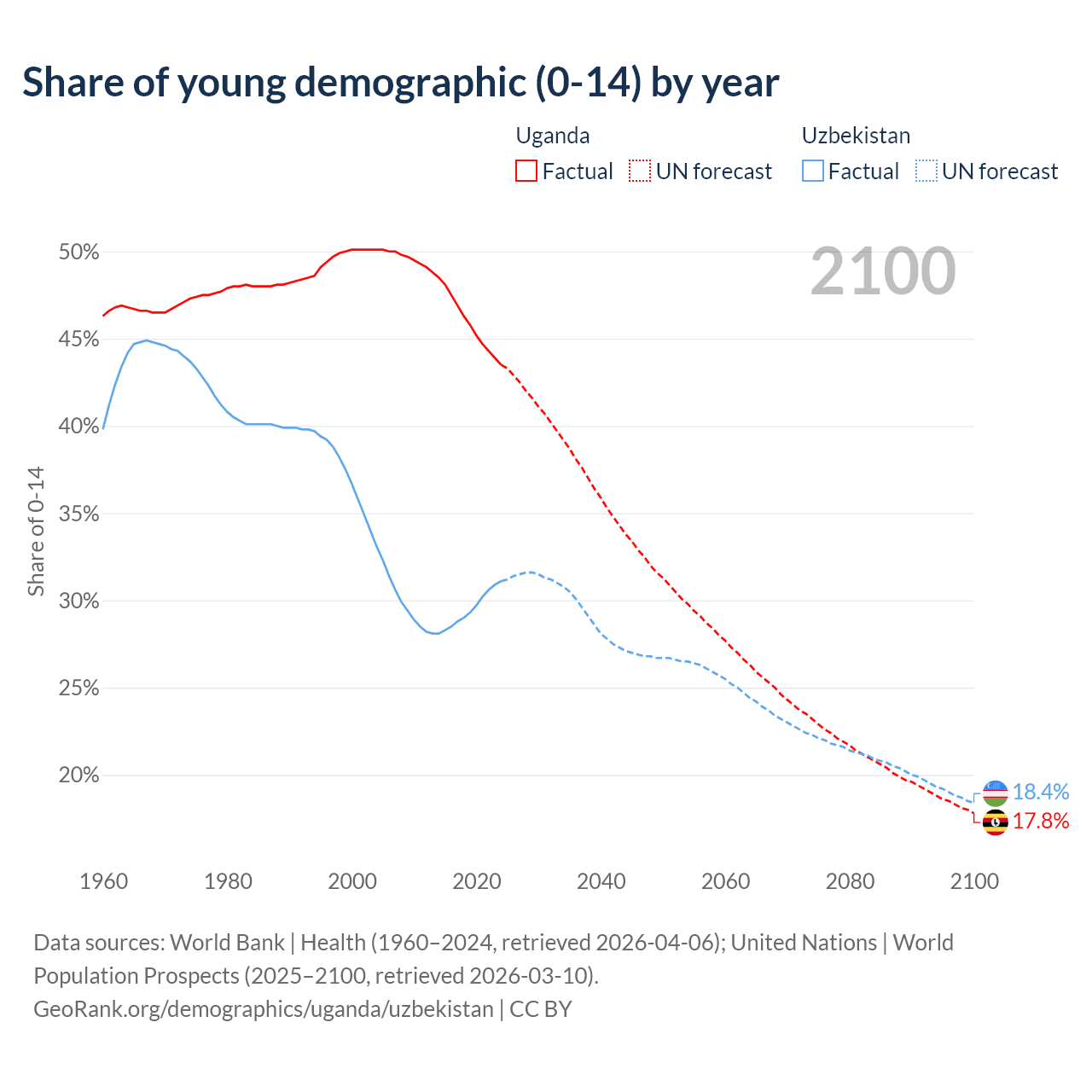 - As of 2026, the population of Uganda is 53.2M vs 37.9M in Uzbekistan - 1.4 times difference.