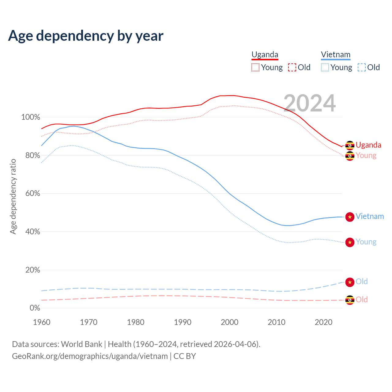 Data sources: World Bank | Health (1960–2024, retrieved 2026-04-06); U.S. Census Bureau (1960–2024, retrieved 2026-02-08).