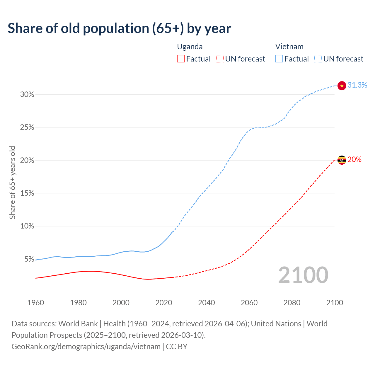 The share of older people aged 65 and over is 2.19% in Uganda and 9.05% in Vietnam. Life expectancy in Uganda compared to Vietnam .