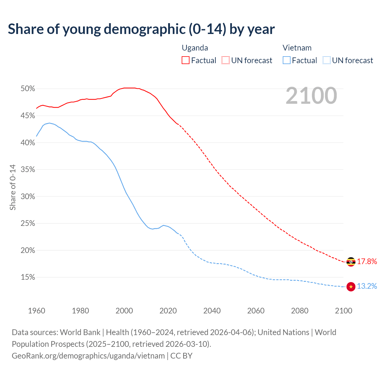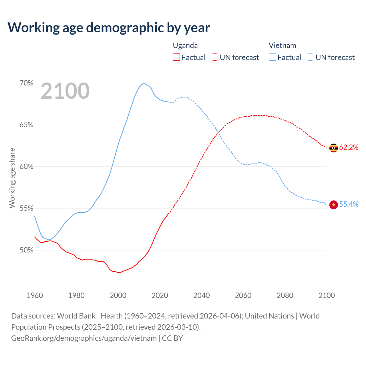 Median age Uganda vs Vietnam, 1960-2100